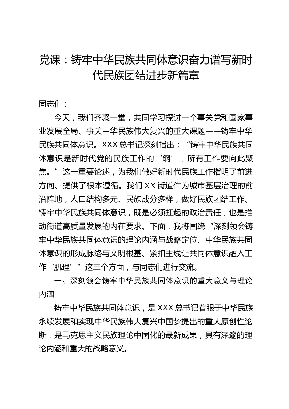 黨課:鑄牢中華民族共同體意識奮力譜寫新時代民族團結進步新篇章同志們:今天,我們齊聚一堂,共同學習探討一個事關黨和國家事業(yè)發(fā)展全局、事關中華民族偉大復興的重大課題——鑄牢中華民族共同體意識。XXX總書記深刻指出:“鑄牢中華民族共同體意識是新時代黨的民族工作的‘綱’,所有工作要向此聚焦。”這一重要論述,為我們做好新時代民族工作指明了前進方向、提供了根本遵循。我們XX街道作為城市基層治理的前沿陣地,人口結構多元、民族成分多樣,做好民族團結工作、鑄牢中華民族共同體意識,既是必須扛起的政治責任,也是推動街道高質量發(fā)展的內在要求。下面,我將...