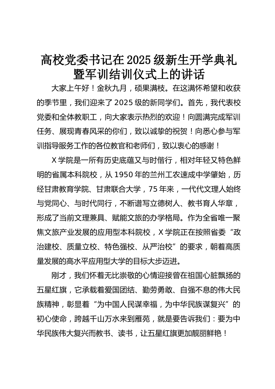 高校黨委書記在2025級新生開學(xué)典禮暨軍訓(xùn)結(jié)訓(xùn)儀式上的講話大家上午好!金秋九月,碩果滿枝。在這滿懷希望和收獲的季節(jié)里,我們迎來了2025級的新同學(xué)們。首先,我代表校黨委和全體教職工,向大家表示熱烈的歡迎!向圓滿完成軍訓(xùn)任務(wù)、展現(xiàn)青春風(fēng)采的你們,致以誠摯的祝賀!向悉心參與軍訓(xùn)指導(dǎo)服務(wù)工作的各位教官和老師們,致以衷心的感謝!X學(xué)院是一所有歷史底蘊(yùn)又與時偕行,相對年輕又特色鮮明的省屬本科院校,從1950年的蘭州工農(nóng)速成中學(xué)肇始,歷經(jīng)甘肅教育學(xué)院、甘肅聯(lián)合大學(xué),75年來,一代代文理人始終與黨同心、與時代同行,不斷譜寫立德樹人、教書育人華章,形成了...