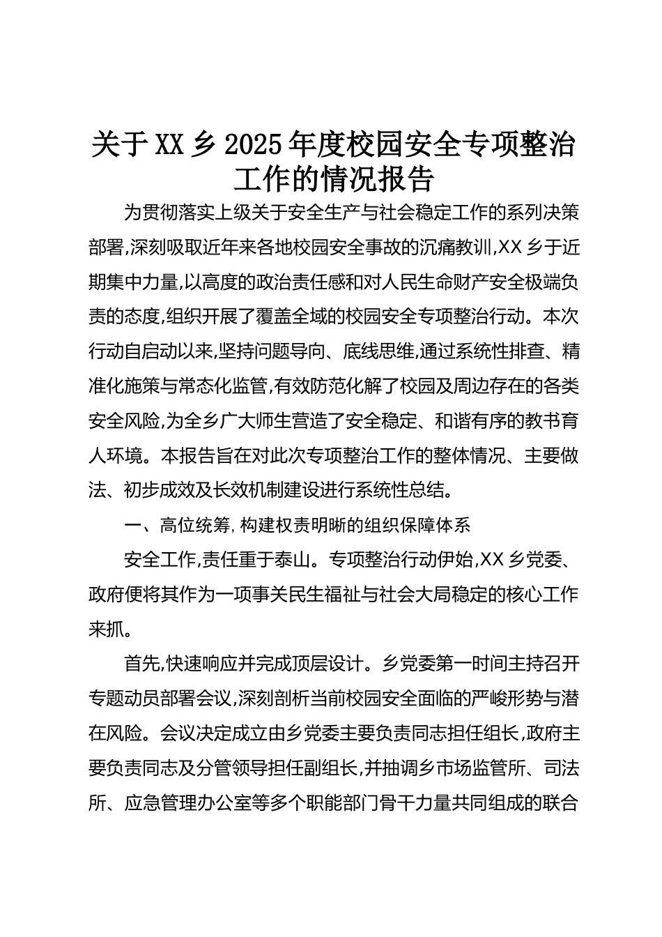 關(guān)于XX鄉(xiāng)2025年度校園安全專項(xiàng)整治工作的情況報(bào)告為貫徹落實(shí)上級(jí)關(guān)于安全生產(chǎn)與社會(huì)穩(wěn)定工作的系列決策部署,深刻吸取近年來(lái)各地校園安全事故的沉痛教訓(xùn),XX鄉(xiāng)于近期集中力量,以高度的政治責(zé)任感和對(duì)人民生命財(cái)產(chǎn)安全極端負(fù)責(zé)的態(tài)度,組織開展了覆蓋全域的校園安全專項(xiàng)整治行動(dòng)。本次行動(dòng)自啟動(dòng)以來(lái),堅(jiān)持問(wèn)題導(dǎo)向、底線思維,通過(guò)系統(tǒng)性排查、精準(zhǔn)化施策與常態(tài)化監(jiān)管,有效防范化解了校園及周邊存在的各類安全風(fēng)險(xiǎn),為全鄉(xiāng)廣大師生營(yíng)造了安全穩(wěn)定、和諧有序的教書育人環(huán)境。本報(bào)告旨在對(duì)此次專項(xiàng)整治工作的整體情況、主要做法、初步成效及長(zhǎng)效機(jī)制建設(shè)進(jìn)行系統(tǒng)性總結(jié)。一、高位...