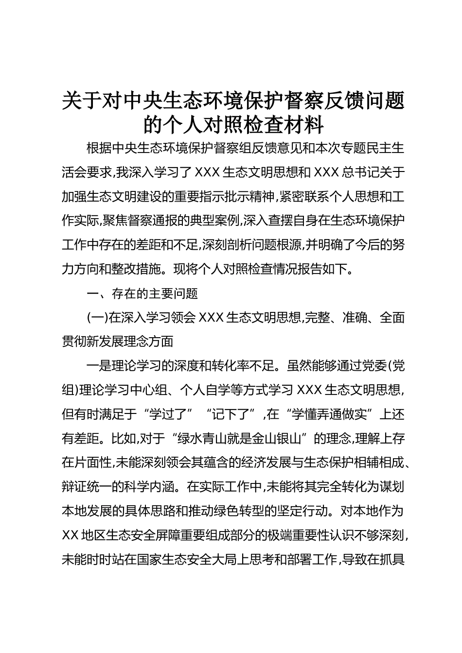 關于對中央生態(tài)環(huán)境保護督察反饋問題的個人對照檢查材料根據中央生態(tài)環(huán)境保護督察組反饋意見和本次專題民主生活會要求,我深入學習了XXX生態(tài)文明思想和XXX總書記關于加強生態(tài)文明建設的重要指示批示精神,緊密聯系個人思想和工作實際,聚焦督察通報的典型案例,深入查擺自身在生態(tài)環(huán)境保護工作中存在的差距和不足,深刻剖析問題根源,并明確了今后的努力方向和整改措施?,F將個人對照檢查情況報告如下。一、存在的主要問題(一)在深入學習領會XXX生態(tài)文明思想,完整、準確、全面貫徹新發(fā)展理念方面一是理論學習的深度和轉化率不足。雖然能夠通過黨委(黨組)理論學習中心組、個人自...