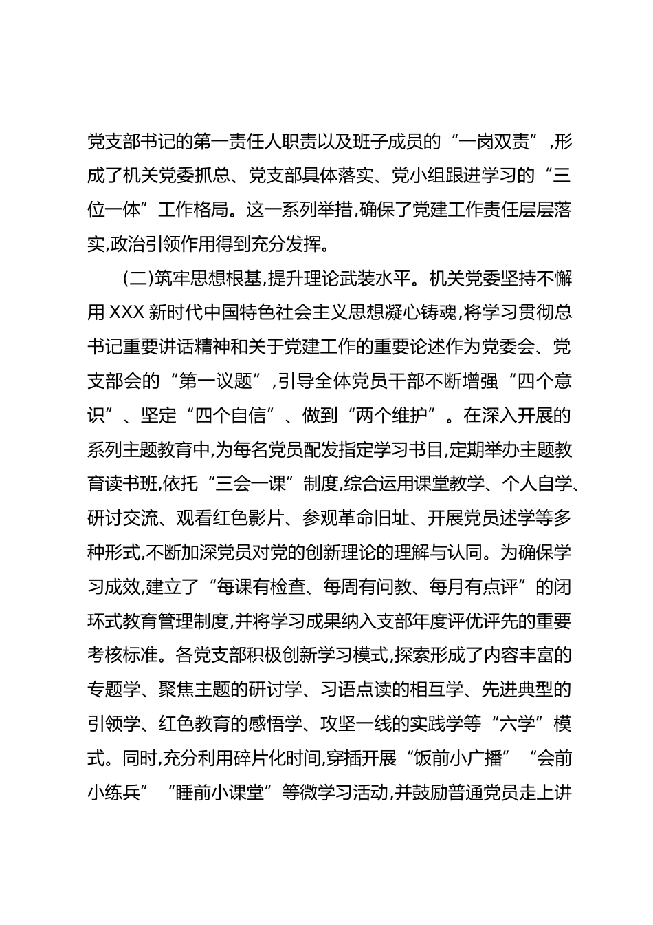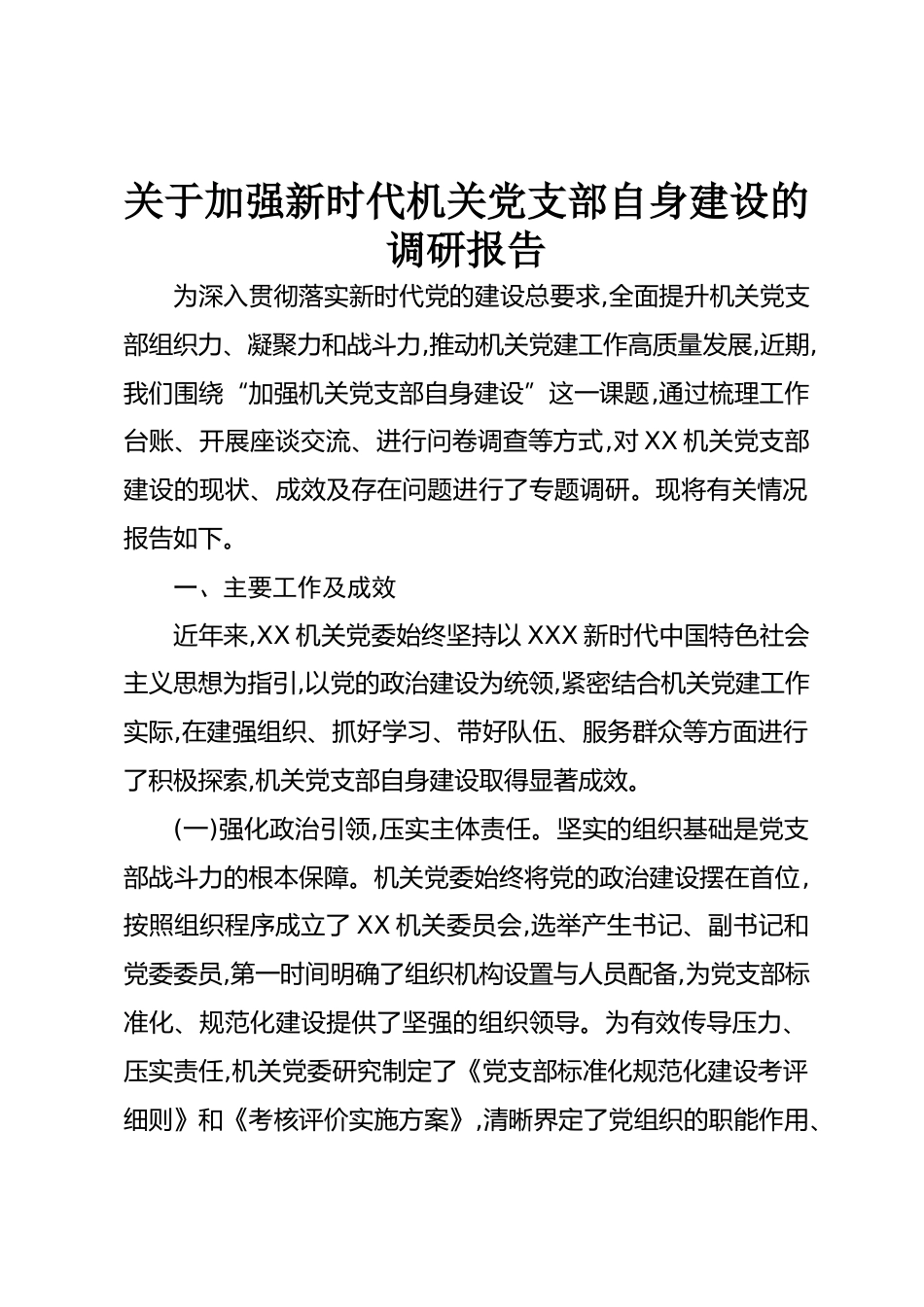 關(guān)于加強(qiáng)新時代機(jī)關(guān)黨支部自身建設(shè)的調(diào)研報告為深入貫徹落實新時代黨的建設(shè)總要求,全面提升機(jī)關(guān)黨支部組織力、凝聚力和戰(zhàn)斗力,推動機(jī)關(guān)黨建工作高質(zhì)量發(fā)展,近期,我們圍繞“加強(qiáng)機(jī)關(guān)黨支部自身建設(shè)”這一課題,通過梳理工作臺賬、開展座談交流、進(jìn)行問卷調(diào)查等方式,對XX機(jī)關(guān)黨支部建設(shè)的現(xiàn)狀、成效及存在問題進(jìn)行了專題調(diào)研。現(xiàn)將有關(guān)情況報告如下。一、主要工作及成效近年來,XX機(jī)關(guān)黨委始終堅持以XXX新時代中國特色社會主義思想為指引,以黨的政治建設(shè)為統(tǒng)領(lǐng),緊密結(jié)合機(jī)關(guān)黨建工作實際,在建強(qiáng)組織、抓好學(xué)習(xí)、帶好隊伍、服務(wù)群眾等方面進(jìn)行了積極探索,機(jī)關(guān)黨支部自身建設(shè)取...
