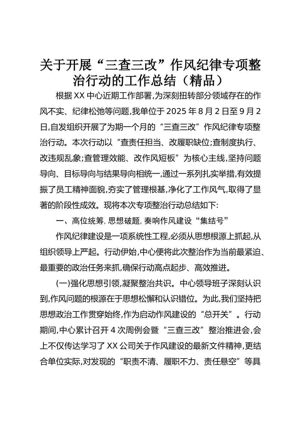關(guān)于開展“三查三改”作風(fēng)紀(jì)律專項(xiàng)整治行動(dòng)的工作總結(jié)(精品)根據(jù)XX中心近期工作部署,為深刻扭轉(zhuǎn)部分領(lǐng)域存在的作風(fēng)不實(shí)、紀(jì)律松弛等問題,我單位于2025年8月2日至9月2日,自發(fā)組織開展了為期一個(gè)月的“三查三改”作風(fēng)紀(jì)律專項(xiàng)整治行動(dòng)。本次行動(dòng)以“查責(zé)任擔(dān)當(dāng)、改履職缺位;查制度執(zhí)行、改違規(guī)亂象;查管理效能、改作風(fēng)短板”為核心主線,堅(jiān)持問題導(dǎo)向、目標(biāo)導(dǎo)向與結(jié)果導(dǎo)向相統(tǒng)一,通過一系列扎實(shí)舉措,有效提振了員工精神面貌,夯實(shí)了管理根基,凈化了工作風(fēng)氣,取得了顯著的階段性成效?,F(xiàn)將本次專項(xiàng)整治行動(dòng)總結(jié)如下:一、高位統(tǒng)籌,思想破題,奏響作風(fēng)建設(shè)“集結(jié)號(hào)”作風(fēng)紀(jì)律建...