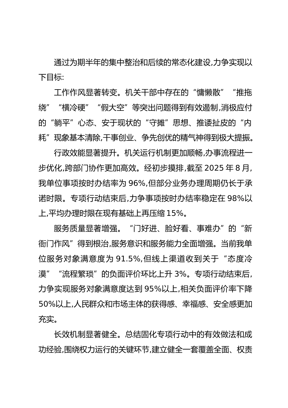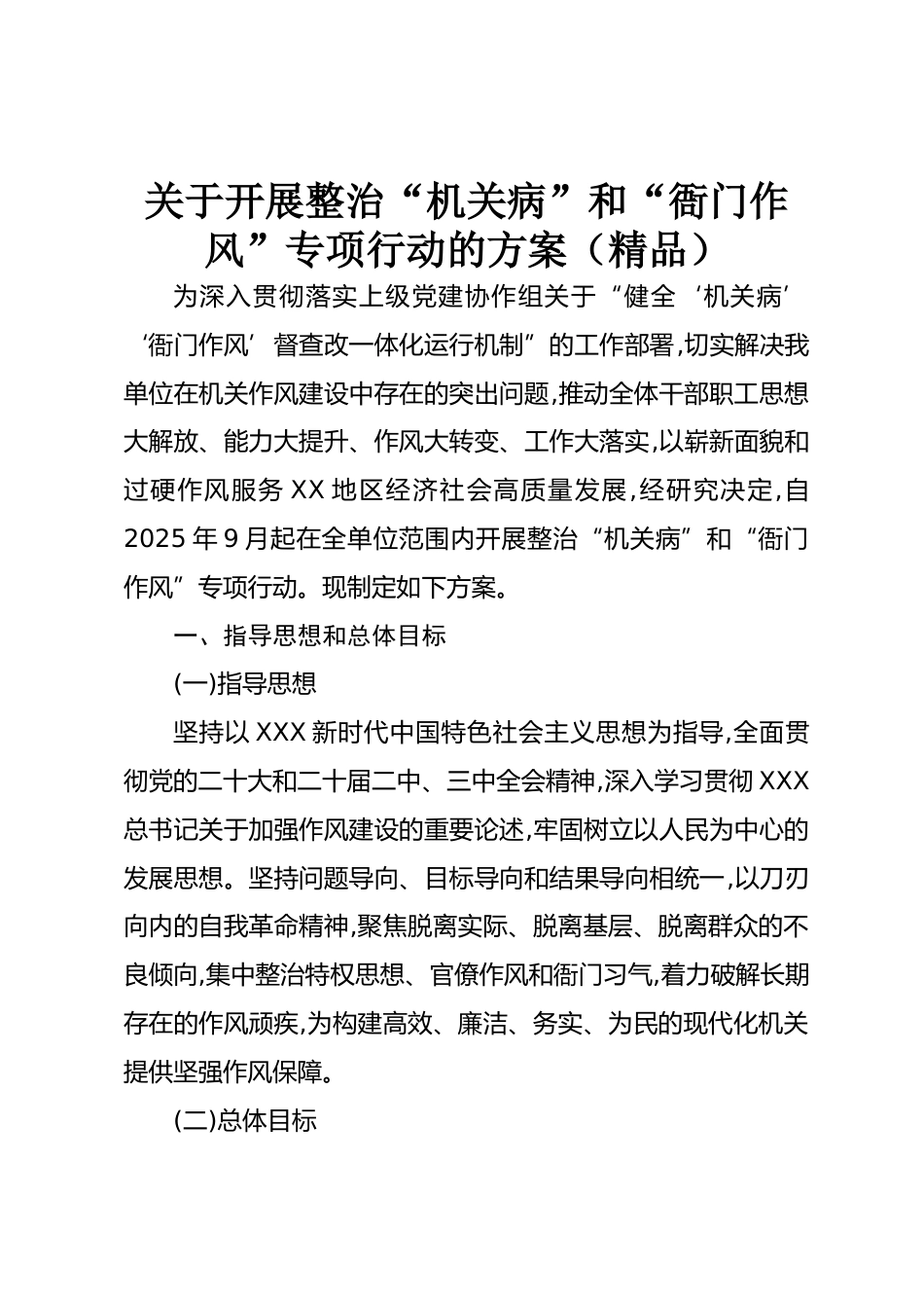 關(guān)于開展整治“機關(guān)病”和“衙門作風(fēng)”專項行動的方案(精品)為深入貫徹落實上級黨建協(xié)作組關(guān)于“健全‘機關(guān)病’‘衙門作風(fēng)’督查改一體化運行機制”的工作部署,切實解決我單位在機關(guān)作風(fēng)建設(shè)中存在的突出問題,推動全體干部職工思想大解放、能力大提升、作風(fēng)大轉(zhuǎn)變、工作大落實,以嶄新面貌和過硬作風(fēng)服務(wù)XX地區(qū)經(jīng)濟(jì)社會高質(zhì)量發(fā)展,經(jīng)研究決定,自2025年9月起在全單位范圍內(nèi)開展整治“機關(guān)病”和“衙門作風(fēng)”專項行動?,F(xiàn)制定如下方案。一、指導(dǎo)思想和總體目標(biāo)(一)指導(dǎo)思想堅持以XXX新時代中國特色社會主義思想為指導(dǎo),全面貫徹黨的二十大和二十屆二中、三中全會精神,深入...