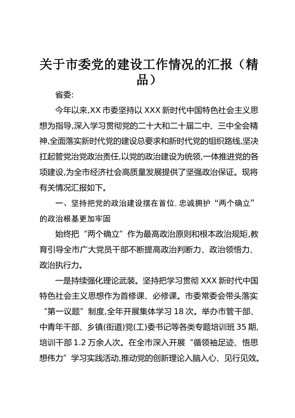 關于市委黨的建設工作情況的匯報(精品)省委:今年以來,XX市委堅持以XXX新時代中國特色社會主義思想為指導,深入學習貫徹黨的二十大和二十屆二中、三中全會精神,全面落實新時代黨的建設總要求和新時代黨的組織路線,堅決扛起管黨治黨政治責任,以黨的政治建設為統(tǒng)領,一體推進黨的各項建設,為全市經(jīng)濟社會高質(zhì)量發(fā)展提供了堅強政治保證?,F(xiàn)將有關情況匯報如下。一、堅持把黨的政治建設擺在首位,忠誠擁護“兩個確立”的政治根基更加牢固始終把“兩個確立”作為最高政治原則和根本政治規(guī)矩,教育引導全市廣大黨員干部不斷提高政治判斷力、政治領悟力、政治執(zhí)行力。一是持續(xù)強化...