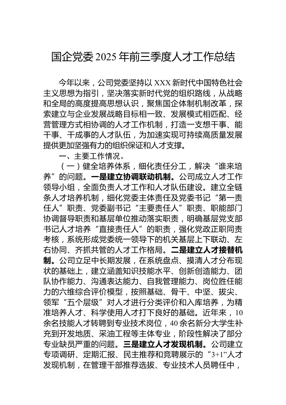 國(guó)企黨委2025年前三季度人才工作總結(jié)今年以來(lái),公司黨委堅(jiān)持以XXX新時(shí)代中國(guó)特色社會(huì)主義思想為指引,堅(jiān)決落實(shí)新時(shí)代黨的組織路線,從戰(zhàn)略和全局的高度提高思想認(rèn)識(shí),聚焦國(guó)企體制機(jī)制改革,探索建立與企業(yè)發(fā)展戰(zhàn)略目標(biāo)相一致、發(fā)展模式相匹配、經(jīng)營(yíng)管理方式相協(xié)調(diào)的人才工作機(jī)制,打造一支想干事、能干事、干成事的人才隊(duì)伍,為加速實(shí)現(xiàn)可持續(xù)高質(zhì)量發(fā)展提供更加堅(jiān)強(qiáng)有力的組織保證和人才支撐。一、主要工作情況。(一)健全培養(yǎng)體系,細(xì)化責(zé)任分工,解決“誰(shuí)來(lái)培養(yǎng)”的問(wèn)題。一是建立協(xié)調(diào)聯(lián)動(dòng)機(jī)制。公司成立人才工作領(lǐng)導(dǎo)小組,全面負(fù)責(zé)人才工作和人才隊(duì)伍建設(shè)。建立全...