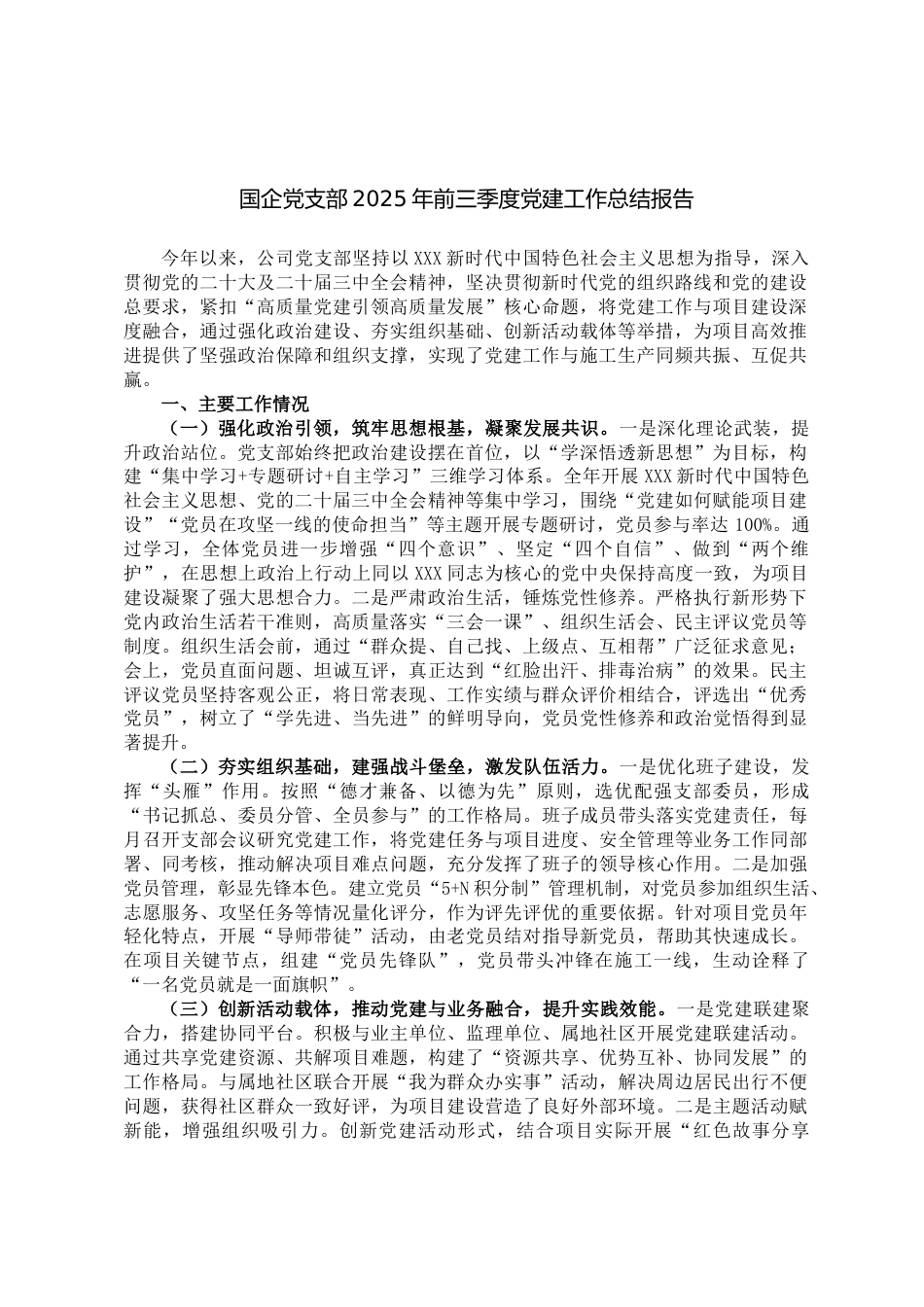 國企黨支部2025年前三季度黨建工作總結(jié)報告今年以來,公司黨支部堅持以XXX新時代中國特色社會主義思想為指導(dǎo),深入貫徹黨的二十大及二十屆三中全會精神,堅決貫徹新時代黨的組織路線和黨的建設(shè)總要求,緊扣“高質(zhì)量黨建引領(lǐng)高質(zhì)量發(fā)展”核心命題,將黨建工作與項目建設(shè)深度融合,通過強化政治建設(shè)、夯實組織基礎(chǔ)、創(chuàng)新活動載體等舉措,為項目高效推進提供了堅強政治保障和組織支撐,實現(xiàn)了黨建工作與施工生產(chǎn)同頻共振、互促共贏。一、主要工作情況(一)強化政治引領(lǐng),筑牢思想根基,凝聚發(fā)展共識。一是深化理論武裝,提升政治站位。黨支部始終把政治建設(shè)擺在首位,以“...