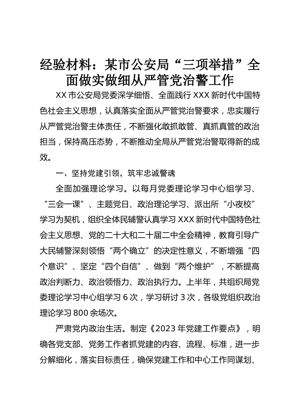 經(jīng)驗(yàn)材料:某市公安局“三項(xiàng)舉措”全面做實(shí)做細(xì)從嚴(yán)管黨治警工作XX市公安局黨委深學(xué)細(xì)悟、全面踐行XXX新時(shí)代中國特色社會(huì)主義思想,認(rèn)真落實(shí)全面從嚴(yán)管黨治警要求,忠實(shí)履行從嚴(yán)管黨治警主體責(zé)任,不斷強(qiáng)化敢抓敢管、真抓真管的政治擔(dān)當(dāng),保持高壓態(tài)勢(shì),不斷推動(dòng)全局從嚴(yán)管黨治警取得新的成效。一、堅(jiān)持黨建引領(lǐng),筑牢忠誠警魂全面加強(qiáng)理論學(xué)習(xí)。以每月黨委理論學(xué)習(xí)中心組學(xué)習(xí)、“三會(huì)一課”、主題黨日、政治理論學(xué)習(xí)、派出所“小夜校”學(xué)習(xí)為契機(jī),組織全體民輔警認(rèn)真學(xué)習(xí)XXX新時(shí)代中國特色社會(huì)主義思想、黨的二十大和二十屆二中全會(huì)精神,教育引導(dǎo)廣大民輔警深刻領(lǐng)悟“...