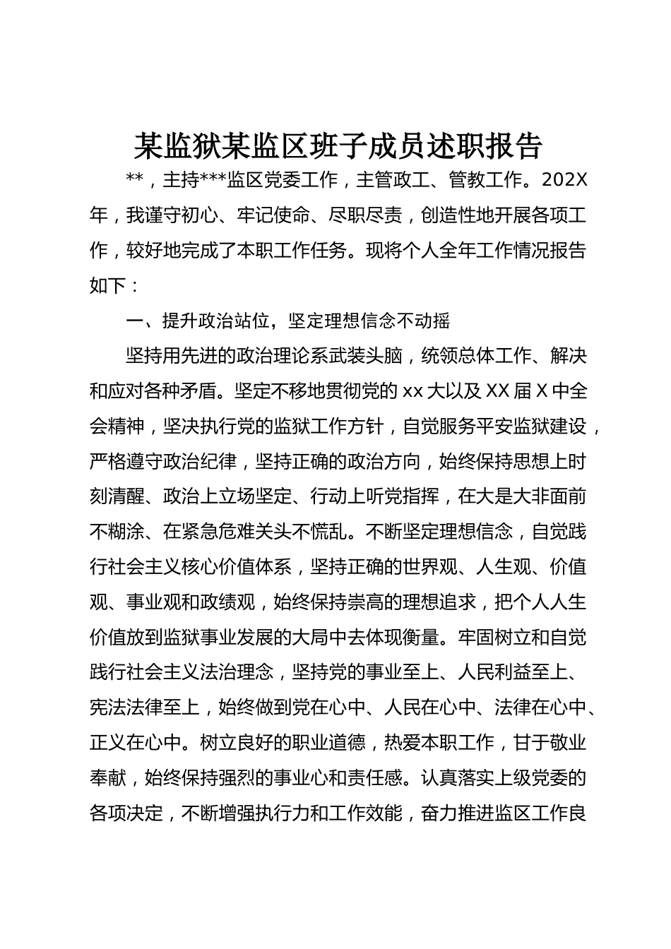 某監(jiān)獄某監(jiān)區(qū)班子成員述職報告**,主持***監(jiān)區(qū)黨委工作,主管政工、管教工作。202X年,我謹守初心、牢記使命、盡職盡責,創(chuàng)造性地開展各項工作,較好地完成了本職工作任務。現(xiàn)將個人全年工作情況報告如下:一、提升政治站位,堅定理想信念不動搖堅持用先進的政治理論系武裝頭腦,統(tǒng)領總體工作、解決和應對各種矛盾。堅定不移地貫徹黨的xx大以及XX屆X中全會精神,堅決執(zhí)行黨的監(jiān)獄工作方針,自覺服務平安監(jiān)獄建設,嚴格遵守政治紀律,堅持正確的政治方向,始終保持思想上時刻清醒、政治上立場堅定、行動上聽黨指揮,在大是大非面前不糊涂、在緊急危難關頭不慌亂。不斷堅定...