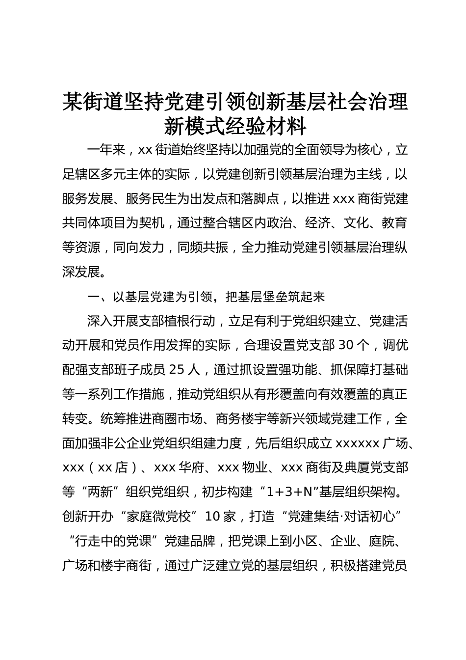 某街道堅(jiān)持黨建引領(lǐng)創(chuàng)新基層社會(huì)治理新模式經(jīng)驗(yàn)材料一年來,xx街道始終堅(jiān)持以加強(qiáng)黨的全面領(lǐng)導(dǎo)為核心,立足轄區(qū)多元主體的實(shí)際,以黨建創(chuàng)新引領(lǐng)基層治理為主線,以服務(wù)發(fā)展、服務(wù)民生為出發(fā)點(diǎn)和落腳點(diǎn),以推進(jìn)xxx商街黨建共同體項(xiàng)目為契機(jī),通過整合轄區(qū)內(nèi)政治、經(jīng)濟(jì)、文化、教育等資源,同向發(fā)力,同頻共振,全力推動(dòng)黨建引領(lǐng)基層治理縱深發(fā)展。一、以基層黨建為引領(lǐng),把基層堡壘筑起來深入開展支部植根行動(dòng),立足有利于黨組織建立、黨建活動(dòng)開展和黨員作用發(fā)揮的實(shí)際,合理設(shè)置黨支部30個(gè),調(diào)優(yōu)配強(qiáng)支部班子成員25人,通過抓設(shè)置強(qiáng)功能、抓保障打基礎(chǔ)等一系列工作措施...
