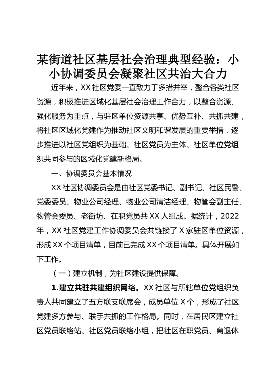 某街道社區(qū)基層社會治理典型經驗:小小協(xié)調委員會凝聚社區(qū)共治大合力近年來,XX社區(qū)黨委一直致力于多措并舉,整合各類社區(qū)資源,積極推進區(qū)域化基層社會治理工作合力,以整合資源、強化服務為重點,與駐區(qū)單位資源共享、優(yōu)勢互補、共抓共建,將社區(qū)區(qū)域化黨建作為推動社區(qū)文明和諧發(fā)展的重要舉措,逐步推進以社區(qū)黨組織為基礎、社區(qū)黨員為主體、社區(qū)單位黨組織共同參與的區(qū)域化黨建新格局。一、協(xié)調委員會基本情況XX社區(qū)協(xié)調委員會是由社區(qū)黨委書記、副書記、社區(qū)民警、黨委委員、物業(yè)公司經理、物業(yè)公司清潔經理、物管會副主任、物管會委員、老街坊、在職黨員共XX人組成...