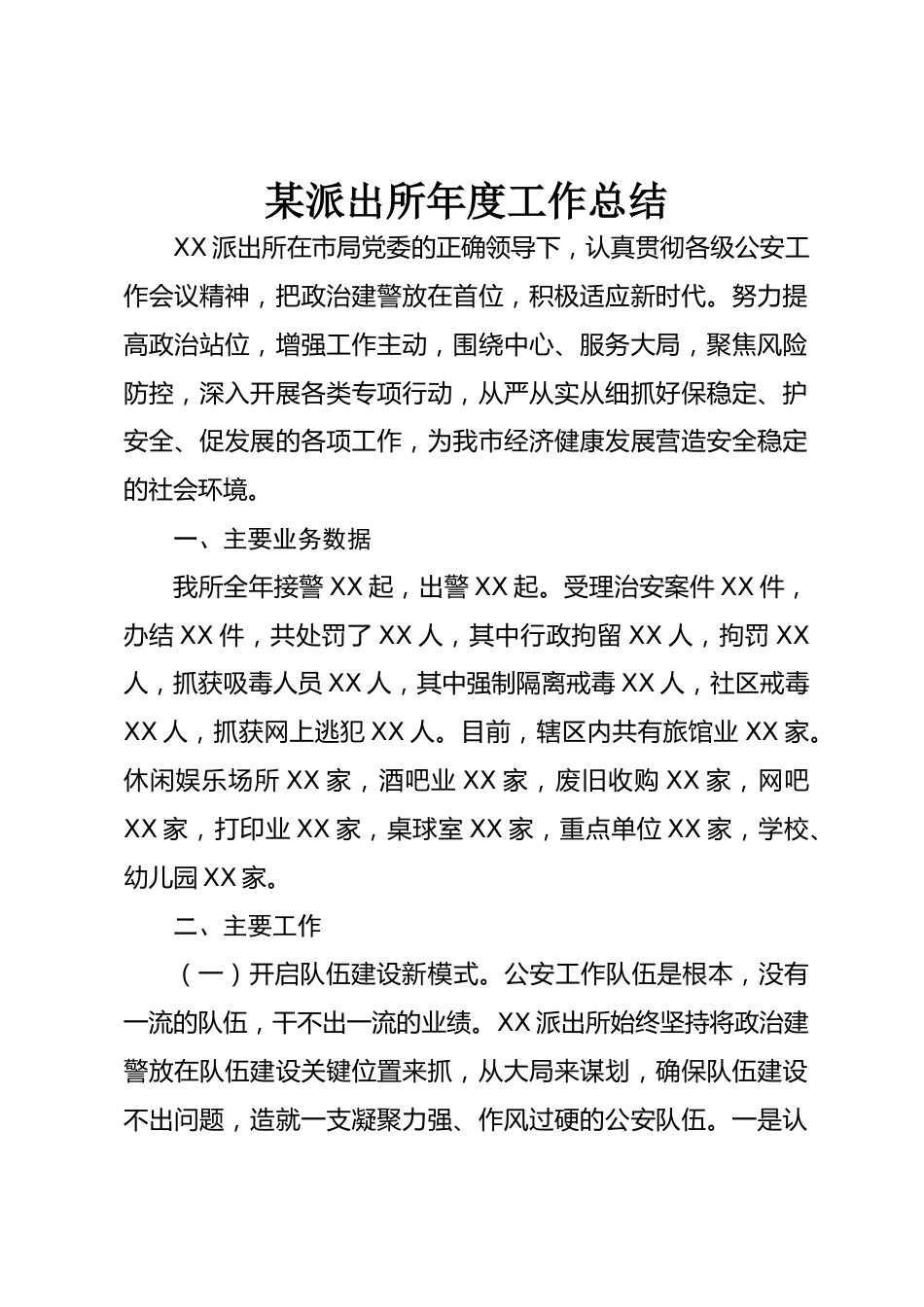 某派出所年度工作總結XX派出所在市局黨委的正確領導下,認真貫徹各級公安工作會議精神,把政治建警放在首位,積極適應新時代。努力提高政治站位,增強工作主動,圍繞中心、服務大局,聚焦風險防控,深入開展各類專項行動,從嚴從實從細抓好保穩(wěn)定、護安全、促發(fā)展的各項工作,為我市經(jīng)濟健康發(fā)展營造安全穩(wěn)定的社會環(huán)境。一、主要業(yè)務數(shù)據(jù)我所全年接警XX起,出警XX起。受理治安案件XX件,辦結XX件,共處罰了XX人,其中行政拘留XX人,拘罰XX人,抓獲吸毒人員XX人,其中強制隔離戒毒XX人,社區(qū)戒毒XX人,抓獲網(wǎng)上逃犯XX人。目前,轄區(qū)內共有旅館業(yè)XX家。休閑娛樂場所XX家,...