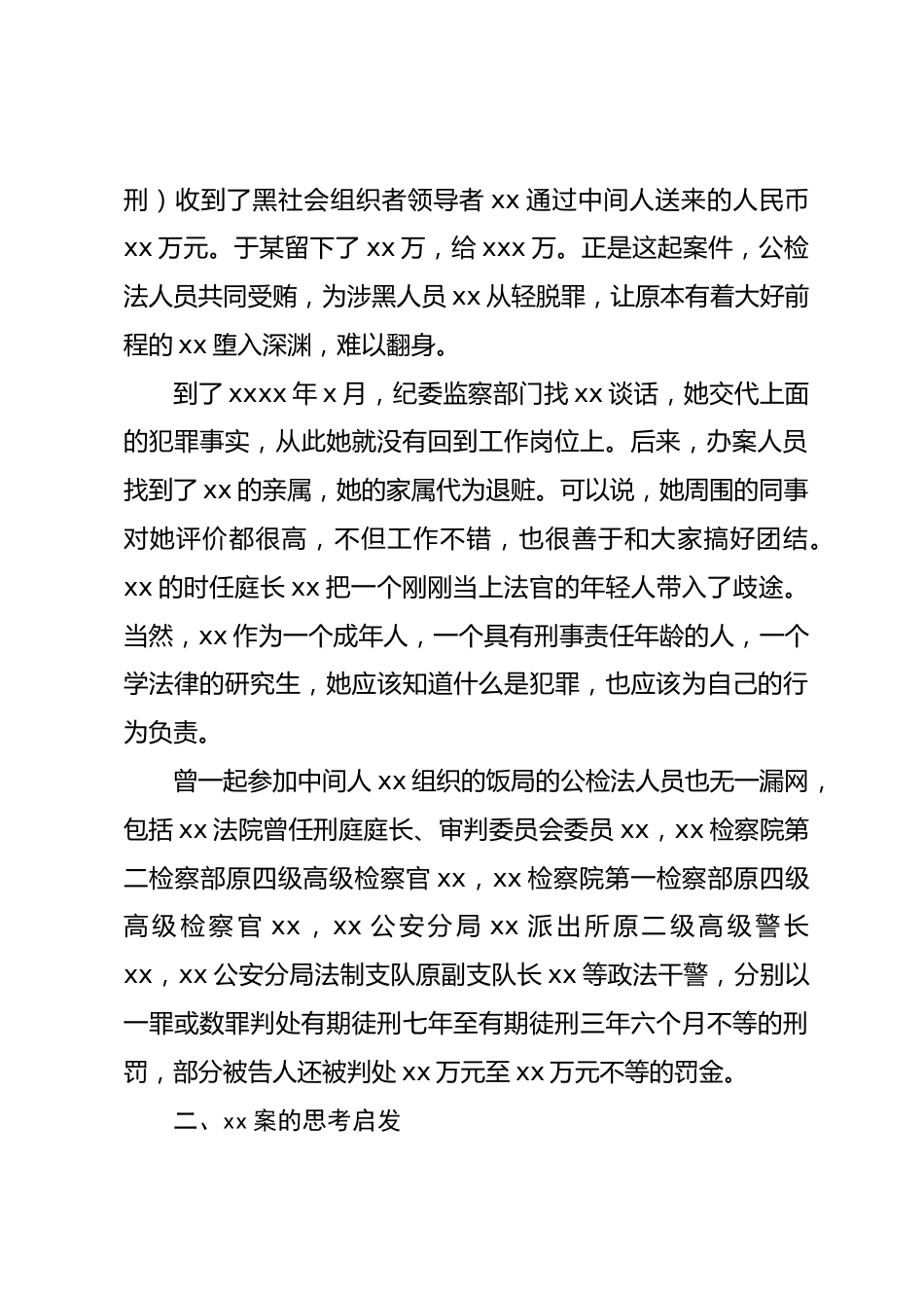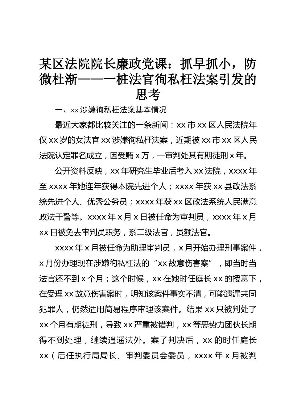 某區(qū)法院院長廉政黨課:抓早抓小,防微杜漸——一樁法官徇私枉法案引發(fā)的思考一、xx涉嫌徇私枉法案基本情況最近大家都比較關(guān)注的一條新聞:xx市xx區(qū)人民法院年僅xx歲的女法官xx涉嫌徇私枉法案,近期被xx市xx區(qū)人民法院認(rèn)定罪名成立,因受賄x萬,一審判處其有期徒刑x年。公開資料反映,xx年研究生畢業(yè)后考入xx法院,xxxx年至xxxx年她連年獲得本院先進(jìn)個(gè)人;xxxx年獲xx縣政法系統(tǒng)先進(jìn)個(gè)人、優(yōu)秀公務(wù)員;xxxx年獲xx區(qū)政法系統(tǒng)人民滿意政法干警等。xxxx年x月x日被任命為審判員,xxxx年x月xx日被免去審判員職務(wù),系二級法官,員額法官。xxxx年x月被任命為助理審判員,x月開始...