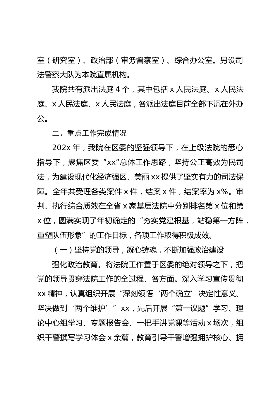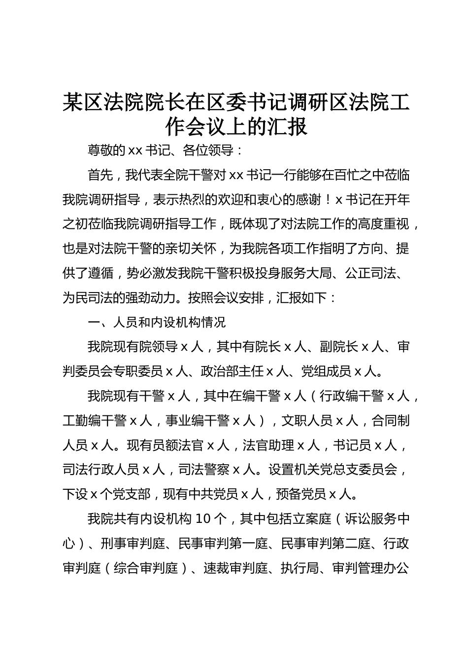 某區(qū)法院院長(zhǎng)在區(qū)委書(shū)記調(diào)研區(qū)法院工作會(huì)議上的匯報(bào)尊敬的xx書(shū)記、各位領(lǐng)導(dǎo):首先,我代表全院干警對(duì)xx書(shū)記一行能夠在百忙之中蒞臨我院調(diào)研指導(dǎo),表示熱烈的歡迎和衷心的感謝!x書(shū)記在開(kāi)年之初蒞臨我院調(diào)研指導(dǎo)工作,既體現(xiàn)了對(duì)法院工作的高度重視,也是對(duì)法院干警的親切關(guān)懷,為我院各項(xiàng)工作指明了方向、提供了遵循,勢(shì)必激發(fā)我院干警積極投身服務(wù)大局、公正司法、為民司法的強(qiáng)勁動(dòng)力。按照會(huì)議安排,匯報(bào)如下:一、人員和內(nèi)設(shè)機(jī)構(gòu)情況我院現(xiàn)有院領(lǐng)導(dǎo)x人,其中有院長(zhǎng)x人、副院長(zhǎng)x人、審判委員會(huì)專(zhuān)職委員x人、政治部主任x人、黨組成員x人。我院現(xiàn)有干警x人,其中在編干警...