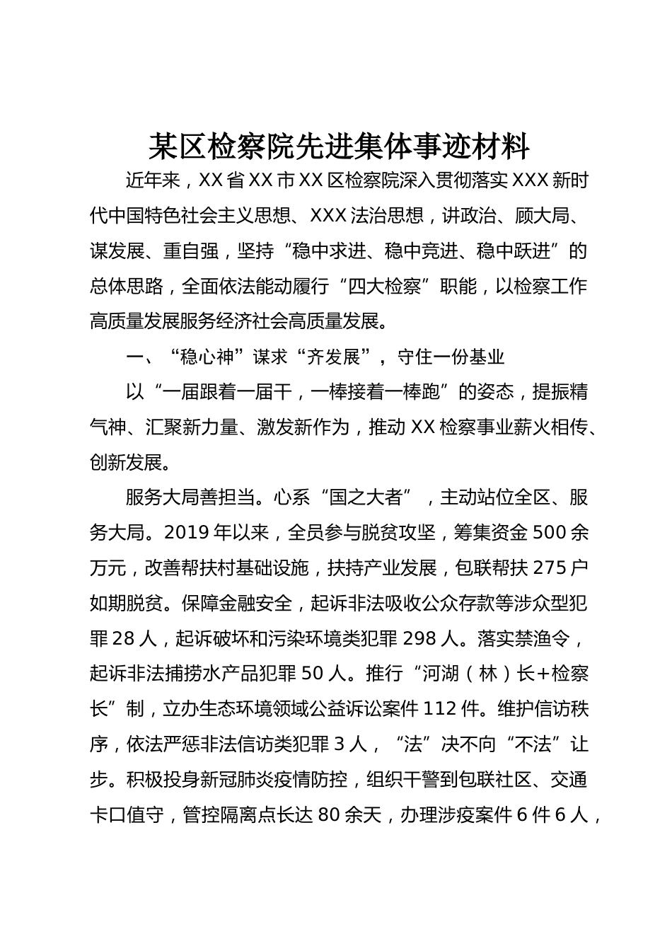 某區(qū)檢察院先進(jìn)集體事跡材料近年來,XX省XX市XX區(qū)檢察院深入貫徹落實(shí)XXX新時(shí)代中國特色社會(huì)主義思想、XXX法治思想,講政治、顧大局、謀發(fā)展、重自強(qiáng),堅(jiān)持“穩(wěn)中求進(jìn)、穩(wěn)中競(jìng)進(jìn)、穩(wěn)中躍進(jìn)”的總體思路,全面依法能動(dòng)履行“四大檢察”職能,以檢察工作高質(zhì)量發(fā)展服務(wù)經(jīng)濟(jì)社會(huì)高質(zhì)量發(fā)展。一、“穩(wěn)心神”謀求“齊發(fā)展”,守住一份基業(yè)以“一屆跟著一屆干,一棒接著一棒跑”的姿態(tài),提振精氣神、匯聚新力量、激發(fā)新作為,推動(dòng)XX檢察事業(yè)薪火相傳、創(chuàng)新發(fā)展。服務(wù)大局善擔(dān)當(dāng)。心系“國之大者”,主動(dòng)站位全區(qū)、服務(wù)大局。2019年以來,全員參與脫貧攻堅(jiān),籌集資金500余萬元,...