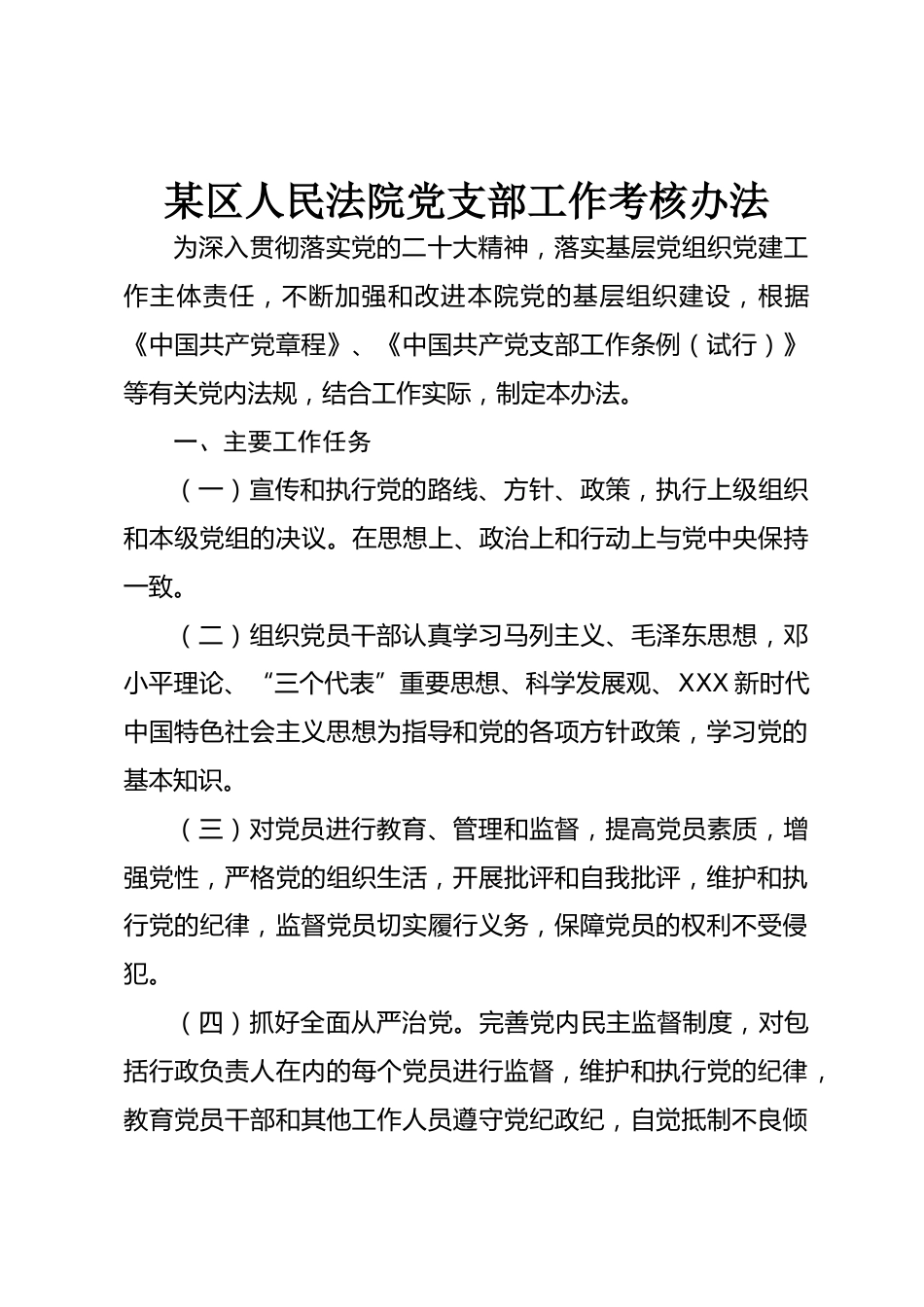 某區(qū)人民法院黨支部工作考核辦法為深入貫徹落實(shí)黨的二十大精神,落實(shí)基層黨組織黨建工作主體責(zé)任,不斷加強(qiáng)和改進(jìn)本院黨的基層組織建設(shè),根據(jù)《中國(guó)共產(chǎn)黨章程》、《中國(guó)共產(chǎn)黨支部工作條例(試行)》等有關(guān)黨內(nèi)法規(guī),結(jié)合工作實(shí)際,制定本辦法。一、主要工作任務(wù)(一)宣傳和執(zhí)行黨的路線、方針、政策,執(zhí)行上級(jí)組織和本級(jí)黨組的決議。在思想上、政治上和行動(dòng)上與黨中央保持一致。(二)組織黨員干部認(rèn)真學(xué)習(xí)馬列主義、毛澤東思想,鄧小平理論、“三個(gè)代表”重要思想、科學(xué)發(fā)展觀、XXX新時(shí)代中國(guó)特色社會(huì)主義思想為指導(dǎo)和黨的各項(xiàng)方針政策,學(xué)習(xí)黨的基本知識(shí)。(三)對(duì)...
