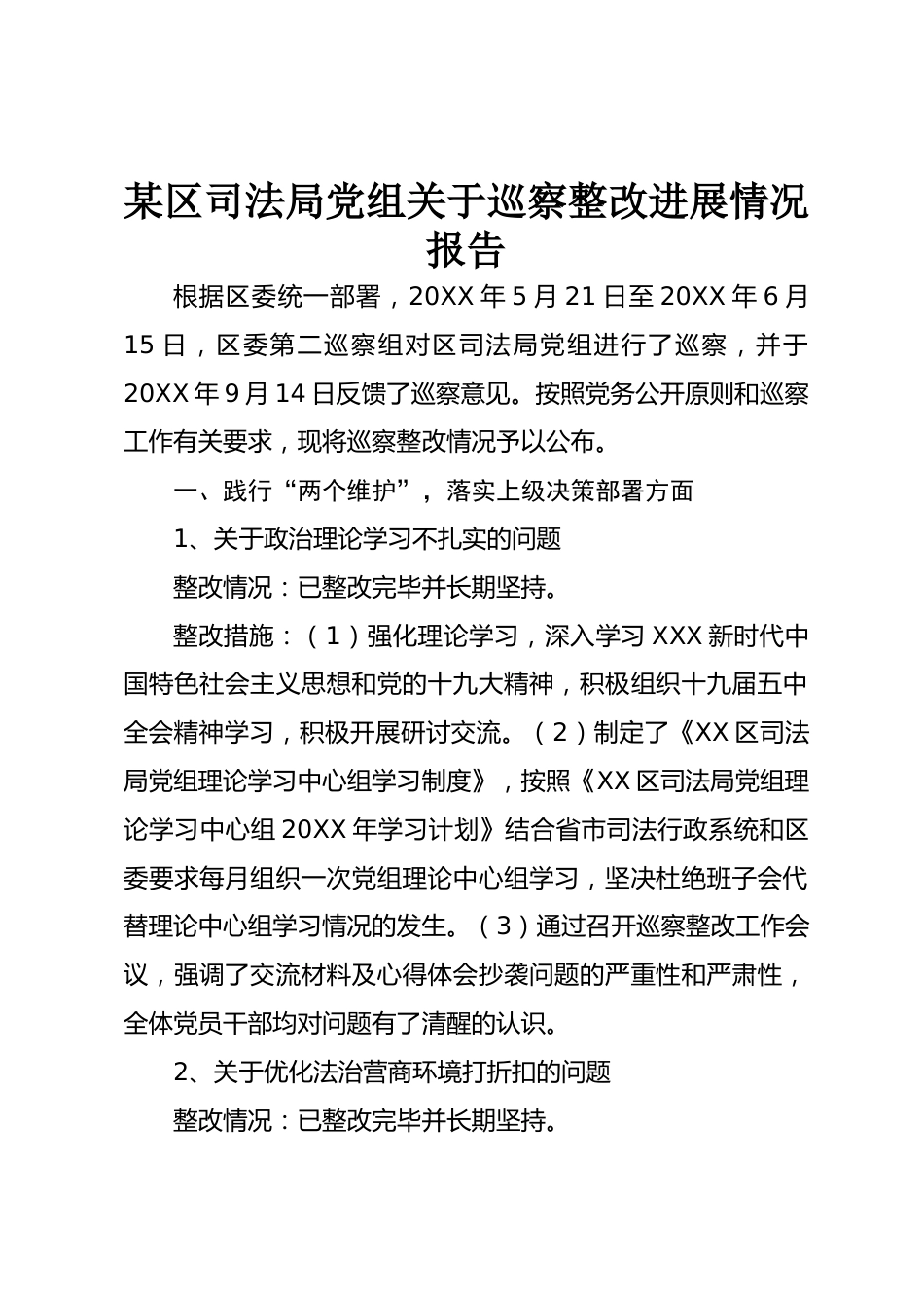 某區(qū)司法局黨組關(guān)于巡察整改進展情況報告根據(jù)區(qū)委統(tǒng)一部署,20XX年5月21日至20XX年6月15日,區(qū)委第二巡察組對區(qū)司法局黨組進行了巡察,并于20XX年9月14日反饋了巡察意見。按照黨務(wù)公開原則和巡察工作有關(guān)要求,現(xiàn)將巡察整改情況予以公布。一、踐行“兩個維護”,落實上級決策部署方面1、關(guān)于政治理論學習不扎實的問題整改情況:已整改完畢并長期堅持。整改措施:(1)強化理論學習,深入學習XXX新時代中國特色社會主義思想和黨的十九大精神,積極組織十九屆五中全會精神學習,積極開展研討交流。(2)制定了《XX區(qū)司法局黨組理論學習中心組學習制度》,按照《XX區(qū)司法局...