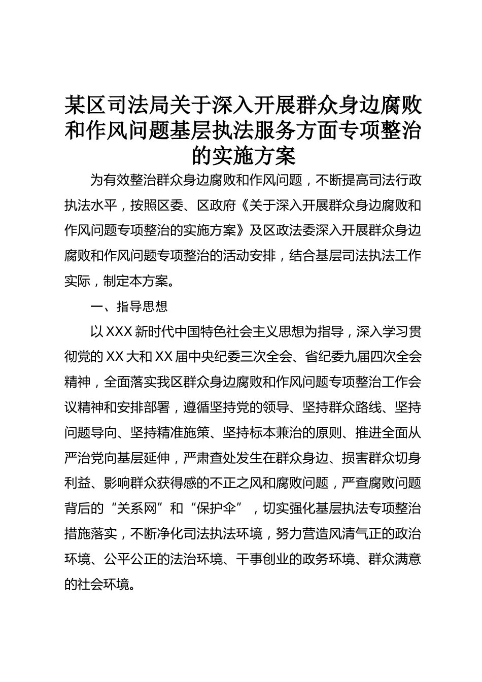 某區(qū)司法局關(guān)于深入開展群眾身邊腐敗和作風(fēng)問題基層執(zhí)法服務(wù)方面專項(xiàng)整治的實(shí)施方案