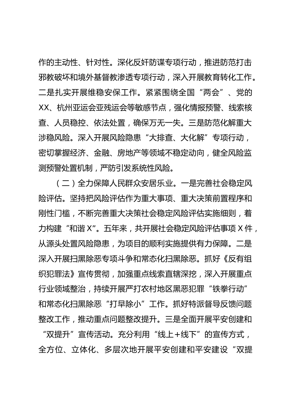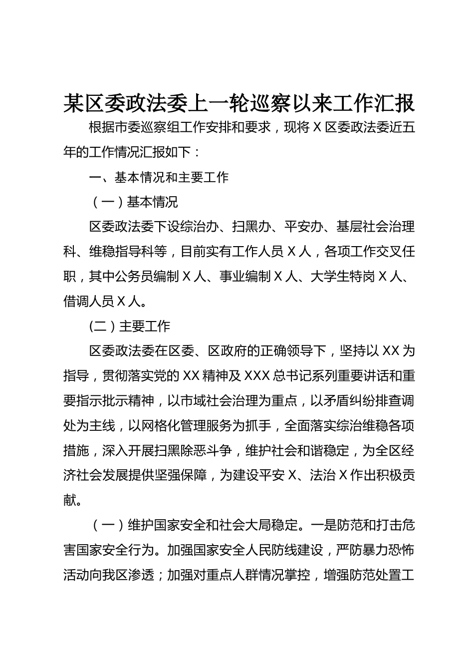 某區(qū)委政法委上一輪巡察以來工作匯報根據(jù)市委巡察組工作安排和要求,現(xiàn)將X區(qū)委政法委近五年的工作情況匯報如下:一、基本情況和主要工作(一)基本情況區(qū)委政法委下設(shè)綜治辦、掃黑辦、平安辦、基層社會治理科、維穩(wěn)指導(dǎo)科等,目前實有工作人員X人,各項工作交叉任職,其中公務(wù)員編制X人、事業(yè)編制X人、大學(xué)生特崗X人、借調(diào)人員X人。(二)主要工作區(qū)委政法委在區(qū)委、區(qū)政府的正確領(lǐng)導(dǎo)下,堅持以XX為指導(dǎo),貫徹落實黨的XX精神及XXX總書記系列重要講話和重要指示批示精神,以市域社會治理為重點,以矛盾糾紛排查調(diào)處為主線,以網(wǎng)格化管理服務(wù)為抓手,全面落實綜治維穩(wěn)各項措...
