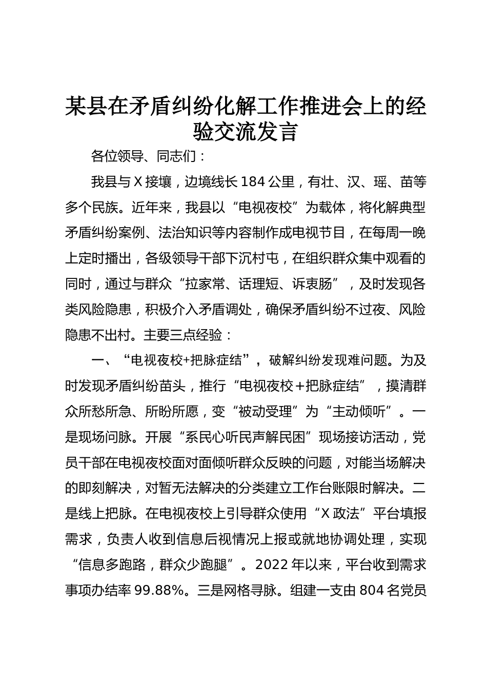 某縣在矛盾糾紛化解工作推進會上的經(jīng)驗交流發(fā)言