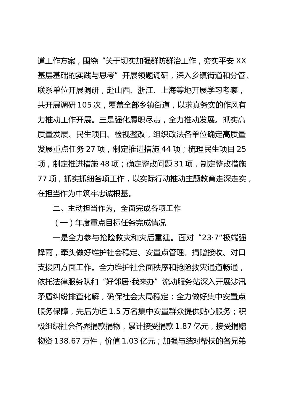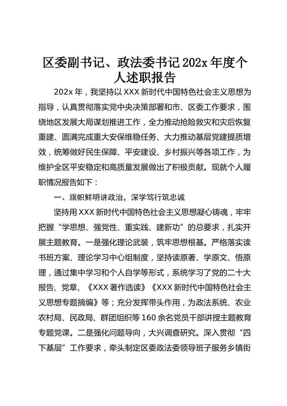 區(qū)委副書記、政法委書記202x年度個(gè)人述職報(bào)告202x年,我堅(jiān)持以XXX新時(shí)代中國特色社會(huì)主義思想為指導(dǎo),認(rèn)真貫徹落實(shí)黨中央決策部署和市、區(qū)委工作要求,圍繞地區(qū)發(fā)展大局謀劃推進(jìn)工作,全力推動(dòng)搶險(xiǎn)救災(zāi)和災(zāi)后恢復(fù)重建、圓滿完成重大安保維穩(wěn)任務(wù)、大力推動(dòng)基層黨建提質(zhì)增效,統(tǒng)籌做好民生保障、平安建設(shè)、鄉(xiāng)村振興等各項(xiàng)工作,為維護(hù)全區(qū)平安穩(wěn)定和高質(zhì)量發(fā)展做出了積極貢獻(xiàn)。現(xiàn)就個(gè)人履職情況報(bào)告如下:一、旗幟鮮明講政治,深學(xué)篤行筑忠誠堅(jiān)持用XXX新時(shí)代中國特色社會(huì)主義思想凝心鑄魂,牢牢把握“學(xué)思想、強(qiáng)黨性、重實(shí)踐、建新功”的總要求,扎實(shí)開展主題教育。一是強(qiáng)...