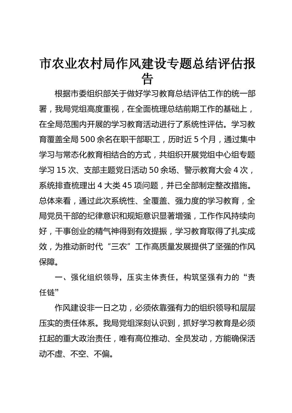 市農(nóng)業(yè)農(nóng)村局作風建設(shè)專題總結(jié)評估報告根據(jù)市委組織部關(guān)于做好學習教育總結(jié)評估工作的統(tǒng)一部署,我局黨組高度重視,在全面梳理總結(jié)前期工作的基礎(chǔ)上,在全局范圍內(nèi)開展的學習教育活動進行了系統(tǒng)性評估。學習教育覆蓋全局500余名在職干部職工,歷時近5個月,通過集中學習與常態(tài)化教育相結(jié)合的方式,共組織開展黨組中心組專題學習15次、支部主題黨日活動50余場、警示教育大會4次,系統(tǒng)排查梳理出4大類45項問題,并已全部制定整改措施??傮w來看,通過此次系統(tǒng)性、全覆蓋、強力度的學習教育,全局黨員干部的紀律意識和規(guī)矩意識顯著增強,工作作風持續(xù)向好,干事創(chuàng)業(yè)的精氣神...