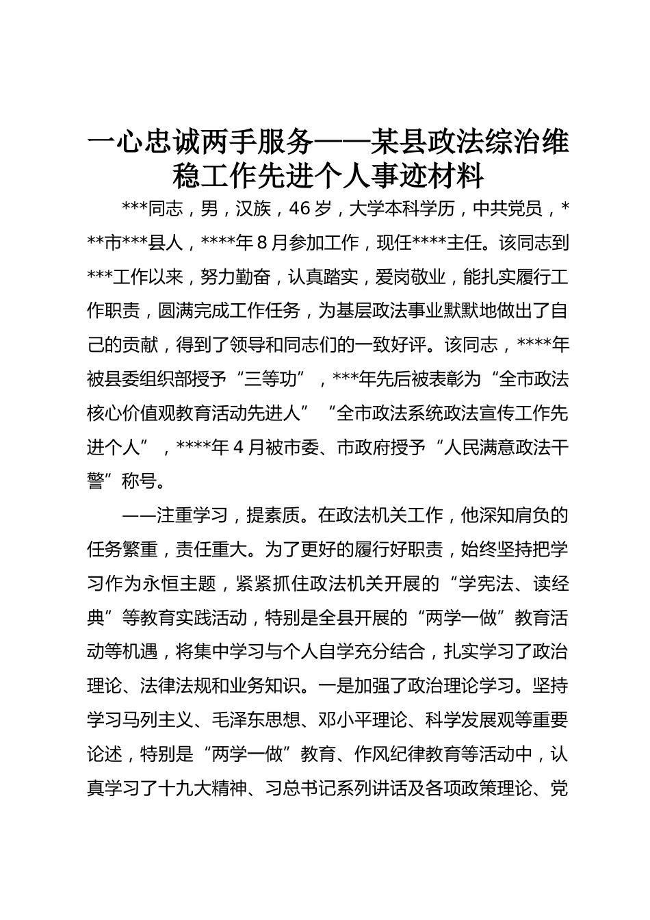 一心忠誠兩手服務(wù)——某縣政法綜治維穩(wěn)工作先進個人事跡材料***同志,男,漢族,46歲,大學(xué)本科學(xué)歷,中共黨員,***市***縣人,****年8月參加工作,現(xiàn)任****主任。該同志到***工作以來,努力勤奮,認真踏實,愛崗敬業(yè),能扎實履行工作職責(zé),圓滿完成工作任務(wù),為基層政法事業(yè)默默地做出了自己的貢獻,得到了領(lǐng)導(dǎo)和同志們的一致好評。該同志,****年被縣委組織部授予“三等功”,***年先后被表彰為“全市政法核心價值觀教育活動先進人”“全市政法系統(tǒng)政法宣傳工作先進個人”,****年4月被市委、市政府授予“人民滿意政法干警”稱號。——注重學(xué)習(xí),提素質(zhì)。在政法機關(guān)工...