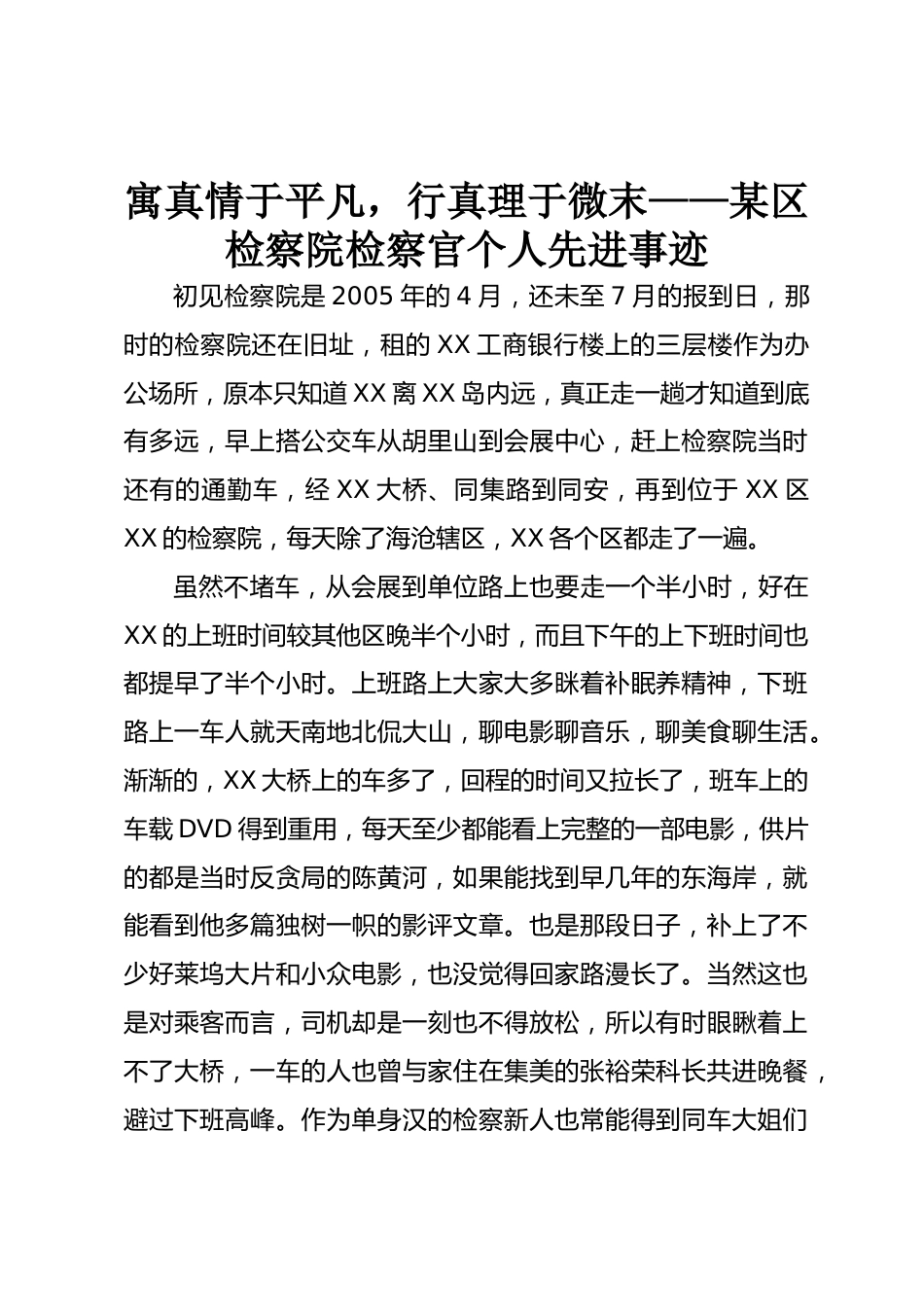 寓真情于平凡,行真理于微末——某區(qū)檢察院檢察官個(gè)人先進(jìn)事跡初見檢察院是2005年的4月,還未至7月的報(bào)到日,那時(shí)的檢察院還在舊址,租的XX工商銀行樓上的三層樓作為辦公場所,原本只知道XX離XX島內(nèi)遠(yuǎn),真正走一趟才知道到底有多遠(yuǎn),早上搭公交車從胡里山到會(huì)展中心,趕上檢察院當(dāng)時(shí)還有的通勤車,經(jīng)XX大橋、同集路到同安,再到位于XX區(qū)XX的檢察院,每天除了海滄轄區(qū),XX各個(gè)區(qū)都走了一遍。雖然不堵車,從會(huì)展到單位路上也要走一個(gè)半小時(shí),好在XX的上班時(shí)間較其他區(qū)晚半個(gè)小時(shí),而且下午的上下班時(shí)間也都提早了半個(gè)小時(shí)。上班路上大家大多瞇著補(bǔ)眠養(yǎng)精神,下班路上一車人...
