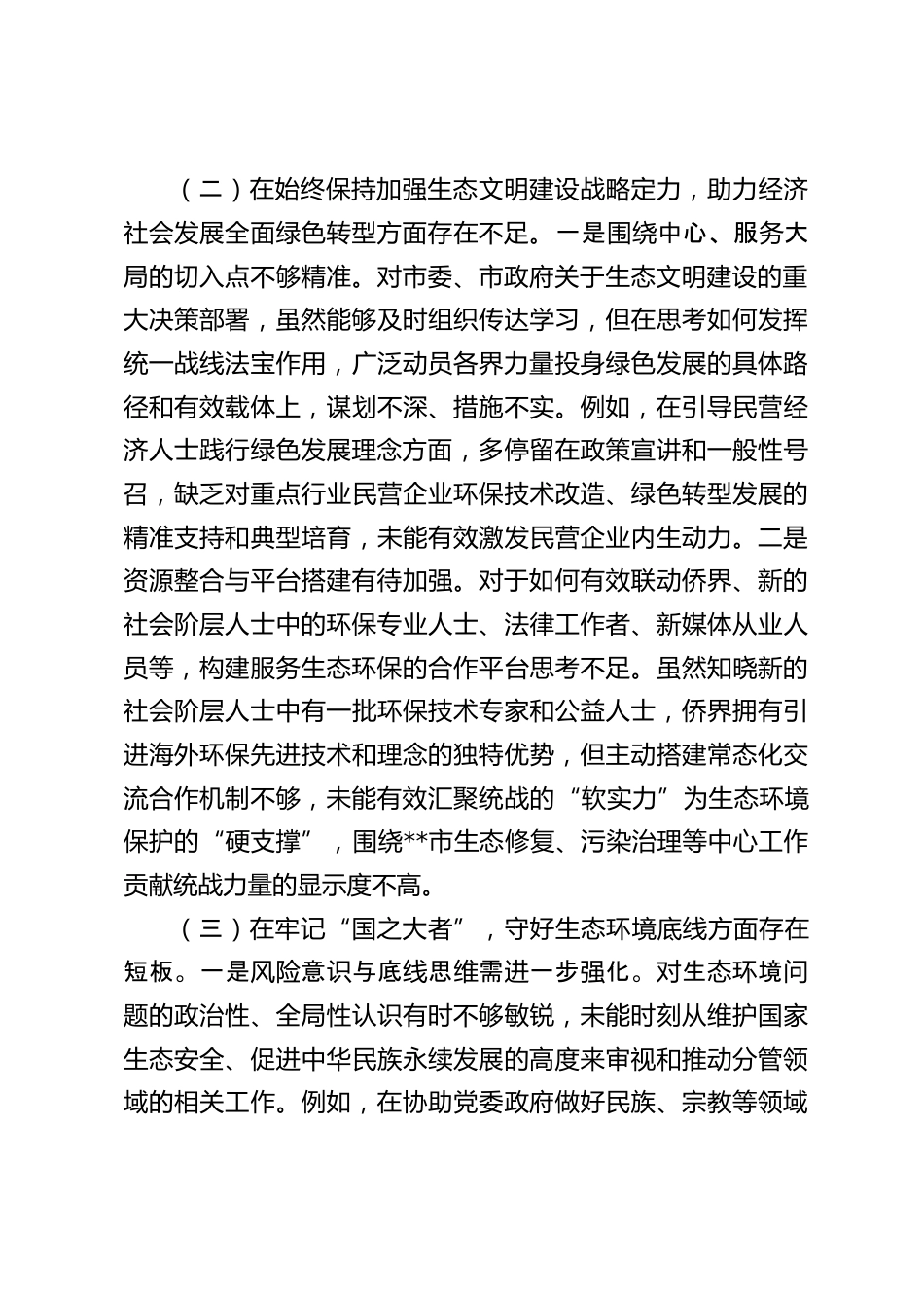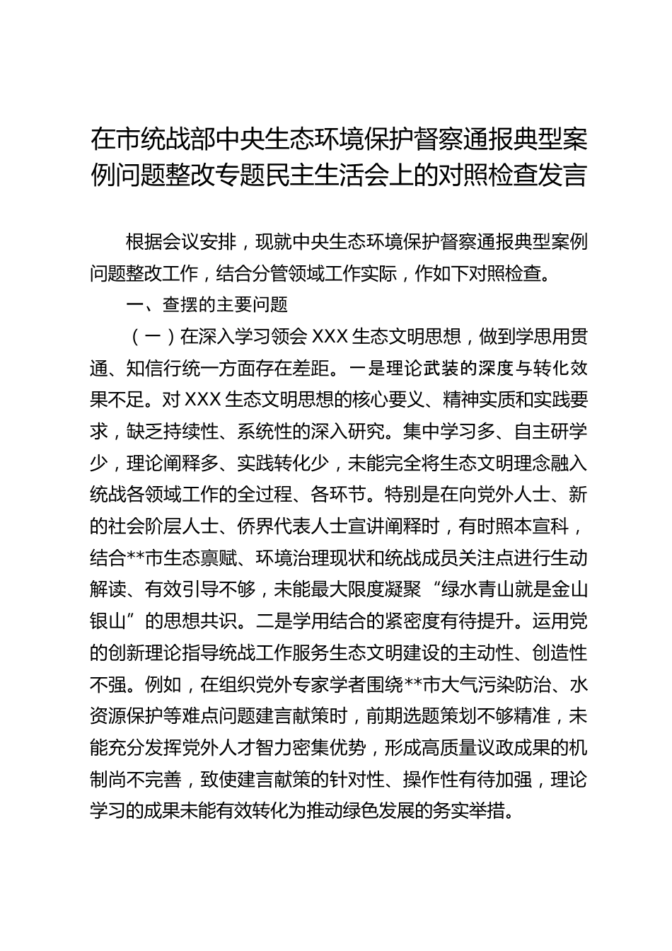 在市統(tǒng)戰(zhàn)部中央生態(tài)環(huán)境保護(hù)督察通報典型案例問題整改專題民主生活會上的對照檢查發(fā)言