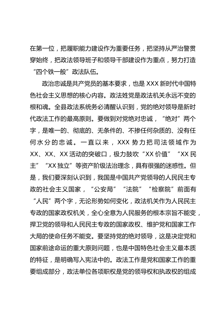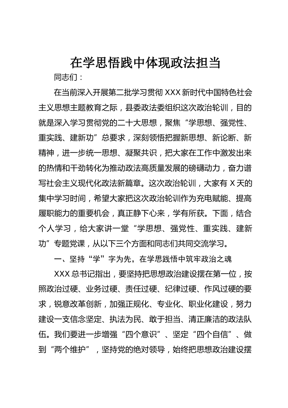 在學(xué)思悟踐中體現(xiàn)政法擔(dān)當(dāng)同志們:在當(dāng)前深入開展第二批學(xué)習(xí)貫徹XXX新時代中國特色社會主義思想主題教育之際,縣委政法委組織這次政治輪訓(xùn),目的就是深入學(xué)習(xí)貫徹黨的二十大思想,聚焦“學(xué)思想、強黨性、重實踐、建新功”總要求,深刻領(lǐng)悟把握新思想、新論斷、新精神,進一步統(tǒng)一思想、凝聚共識,把大家在工作中激發(fā)出來的熱情和干勁轉(zhuǎn)化為推動政法高質(zhì)量發(fā)展的磅礴動力,奮力譜寫社會主義現(xiàn)代化政法新篇章。這次政治輪訓(xùn),大家有X天的集中學(xué)習(xí)時間,希望大家把這次政治輪訓(xùn)作為充電賦能、提高履職能力的重要機會,真正靜下心來,學(xué)有所獲。下面,結(jié)合個人學(xué)習(xí),給大家講...