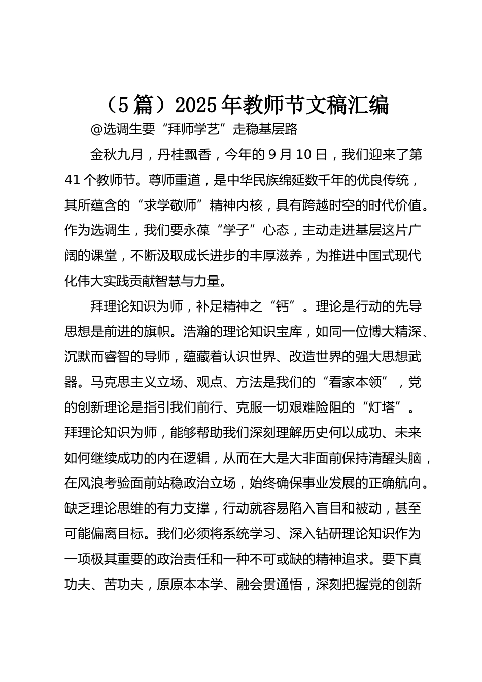 (5篇)2025年教師節(jié)文稿匯編@選調(diào)生要“拜師學(xué)藝”走穩(wěn)基層路金秋九月,丹桂飄香,今年的9月10日,我們迎來(lái)了第41個(gè)教師節(jié)。尊師重道,是中華民族綿延數(shù)千年的優(yōu)良傳統(tǒng),其所蘊(yùn)含的“求學(xué)敬師”精神內(nèi)核,具有跨越時(shí)空的時(shí)代價(jià)值。作為選調(diào)生,我們要永葆“學(xué)子”心態(tài),主動(dòng)走進(jìn)基層這片廣闊的課堂,不斷汲取成長(zhǎng)進(jìn)步的豐厚滋養(yǎng),為推進(jìn)中國(guó)式現(xiàn)代化偉大實(shí)踐貢獻(xiàn)智慧與力量。拜理論知識(shí)為師,補(bǔ)足精神之“鈣”。理論是行動(dòng)的先導(dǎo)思想是前進(jìn)的旗幟。浩瀚的理論知識(shí)寶庫(kù),如同一位博大精深、沉默而睿智的導(dǎo)師,蘊(yùn)藏著認(rèn)識(shí)世界、改造世界的強(qiáng)大思想武器。馬克思主義立場(chǎng)、...