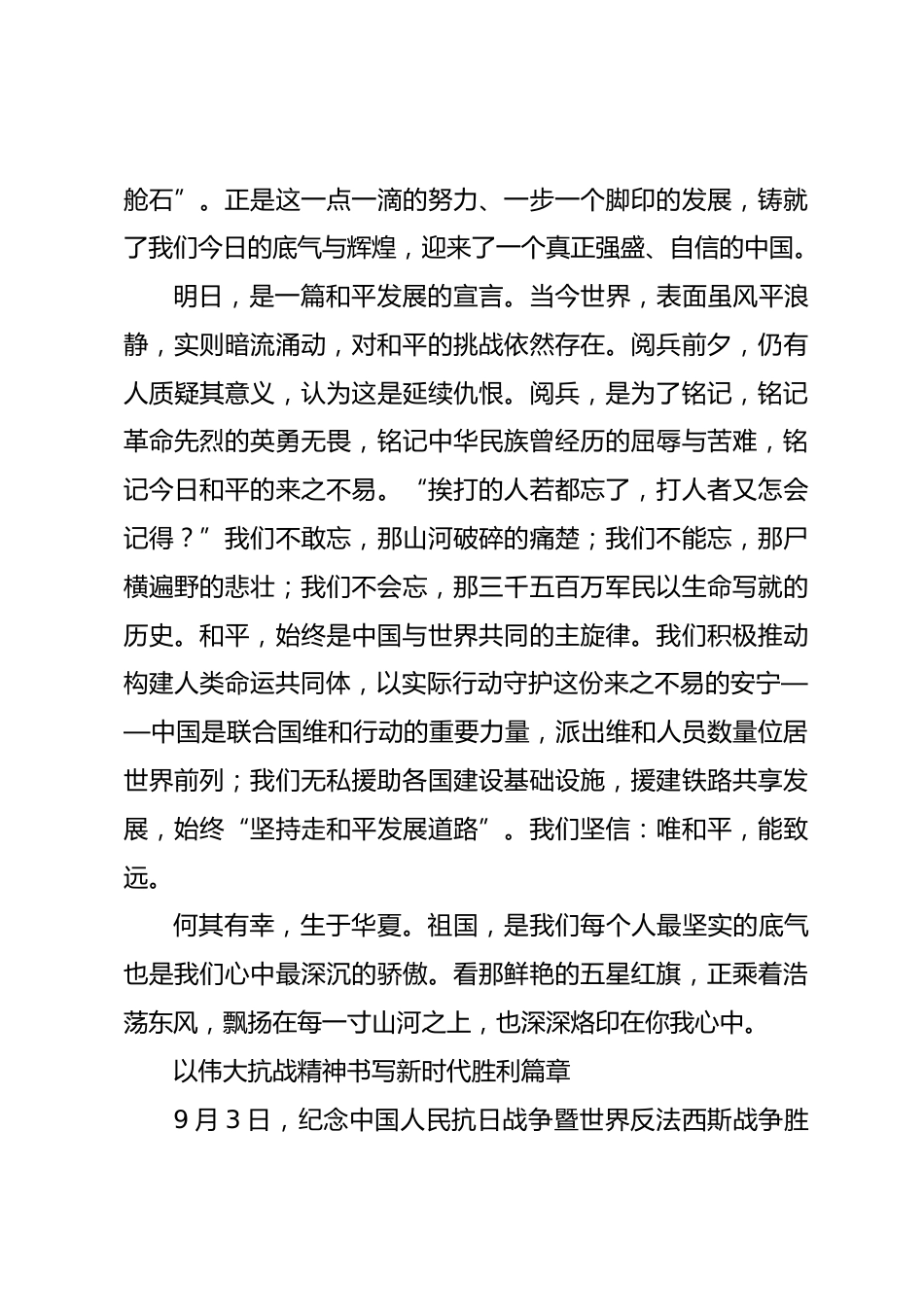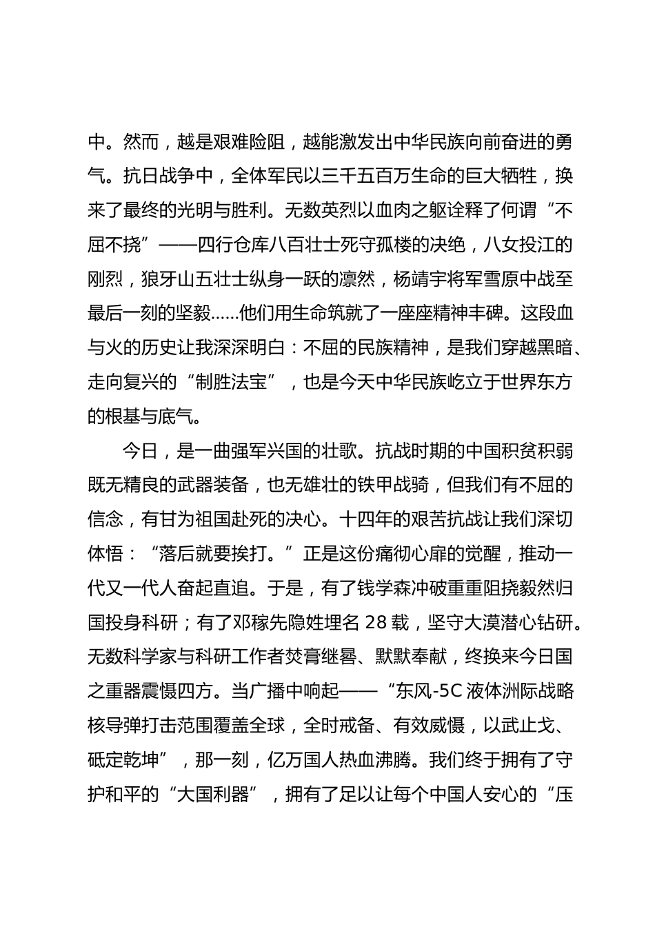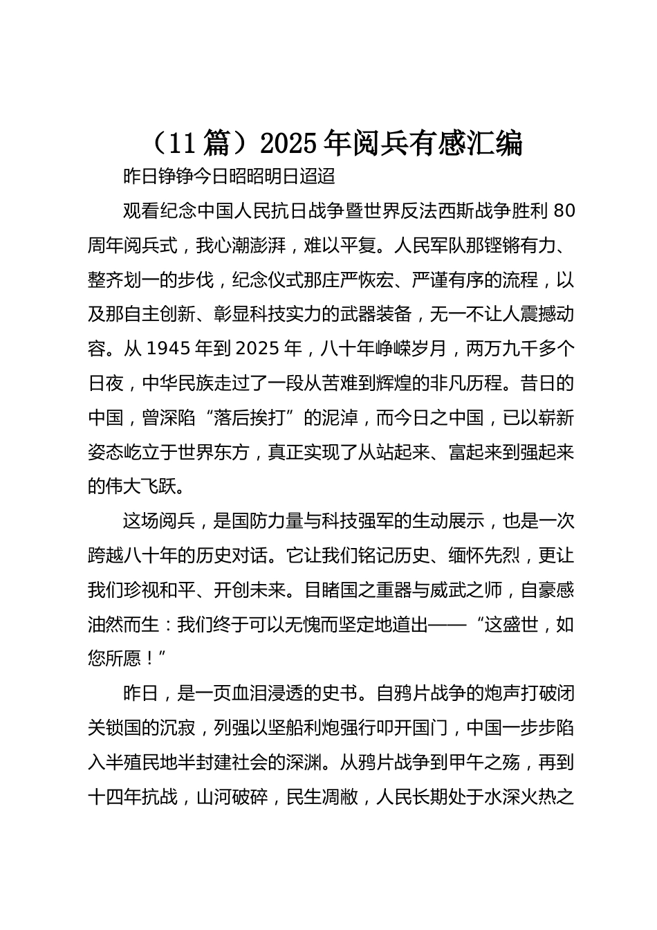 (11篇)2025年閱兵有感匯編昨日錚錚今日昭昭明日迢迢觀看紀念中國人民抗日戰(zhàn)爭暨世界反法西斯戰(zhàn)爭勝利80周年閱兵式,我心潮澎湃,難以平復。人民軍隊那鏗鏘有力、整齊劃一的步伐,紀念儀式那莊嚴恢宏、嚴謹有序的流程,以及那自主創(chuàng)新、彰顯科技實力的武器裝備,無一不讓人震撼動容。從1945年到2025年,八十年崢嶸歲月,兩萬九千多個日夜,中華民族走過了一段從苦難到輝煌的非凡歷程。昔日的中國,曾深陷“落后挨打”的泥淖,而今日之中國,已以嶄新姿態(tài)屹立于世界東方,真正實現(xiàn)了從站起來、富起來到強起來的偉大飛躍。這場閱兵,是國防力量與科技強軍的生動展示,也是...
