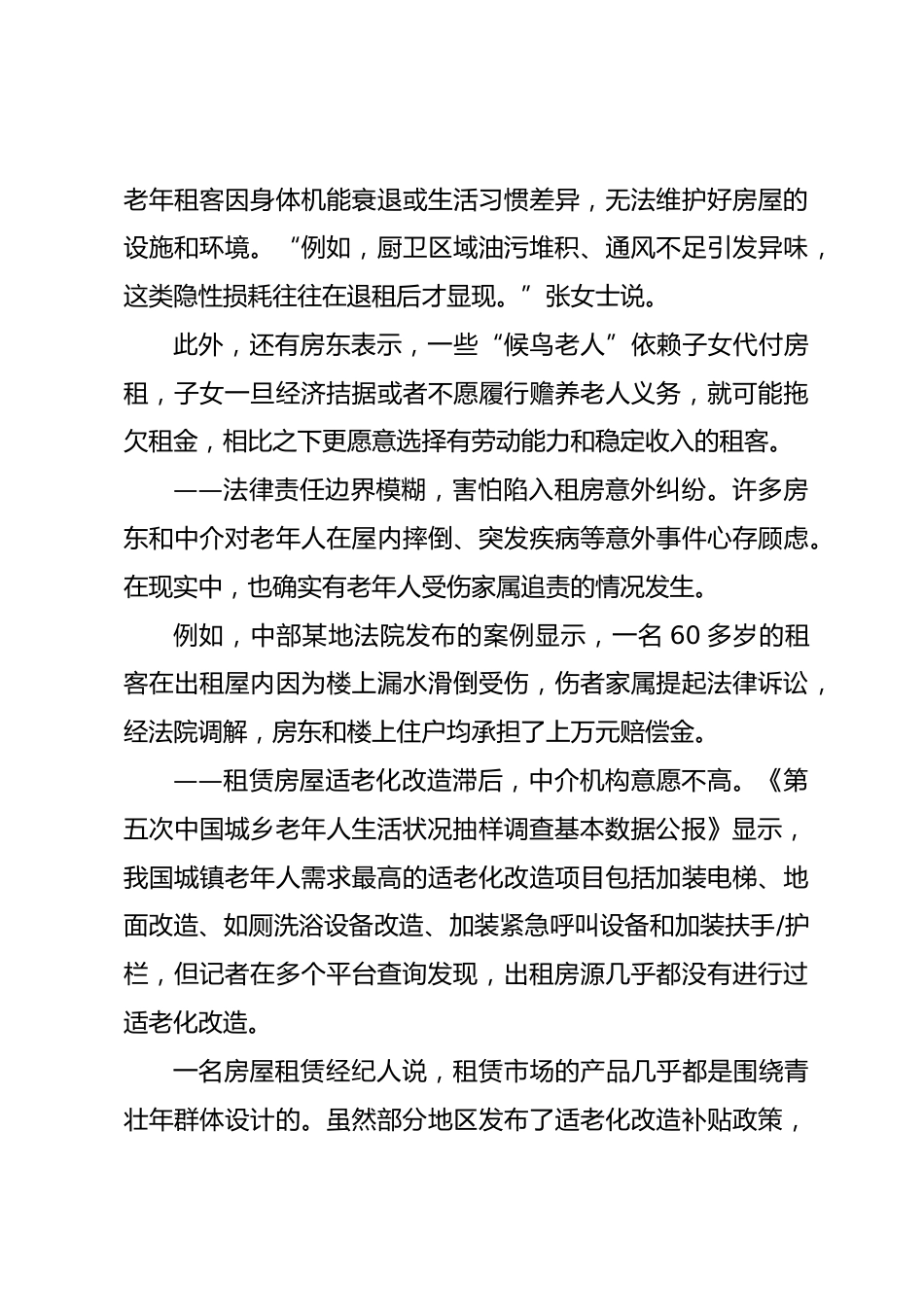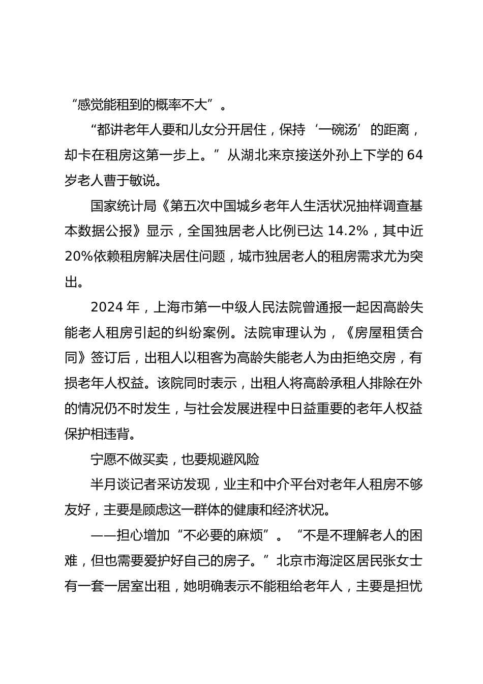 (16篇)2025年8月半月談時(shí)評(píng)匯編“不租給60歲以上老人”,租房豈能有年齡歧視近期,一則“為65歲母親和年邁外婆租房3天被拒20次”的新聞登上熱搜。半月談?dòng)浾哒{(diào)查發(fā)現(xiàn),當(dāng)前老年群體存在租房難現(xiàn)象,部分中介機(jī)構(gòu)明確表示“不租給60歲以上老人”,有的甚至將年齡門檻劃至55歲。以年齡作為租房標(biāo)準(zhǔn)是對(duì)居民居住權(quán)的侵害,應(yīng)當(dāng)將相關(guān)權(quán)益還給老年人。老年人租房遭到年齡歧視開學(xué)季臨近,不少老人為了照顧孫輩,開啟了在學(xué)校附近租房的生活。半月談?dòng)浾咭詾榧抑欣先俗夥繛橛?,咨詢了多家房屋中介機(jī)構(gòu),絕大部分中介明確拒絕租房給超過60歲的老年人。某房產(chǎn)經(jīng)紀(jì)人透露:“公...