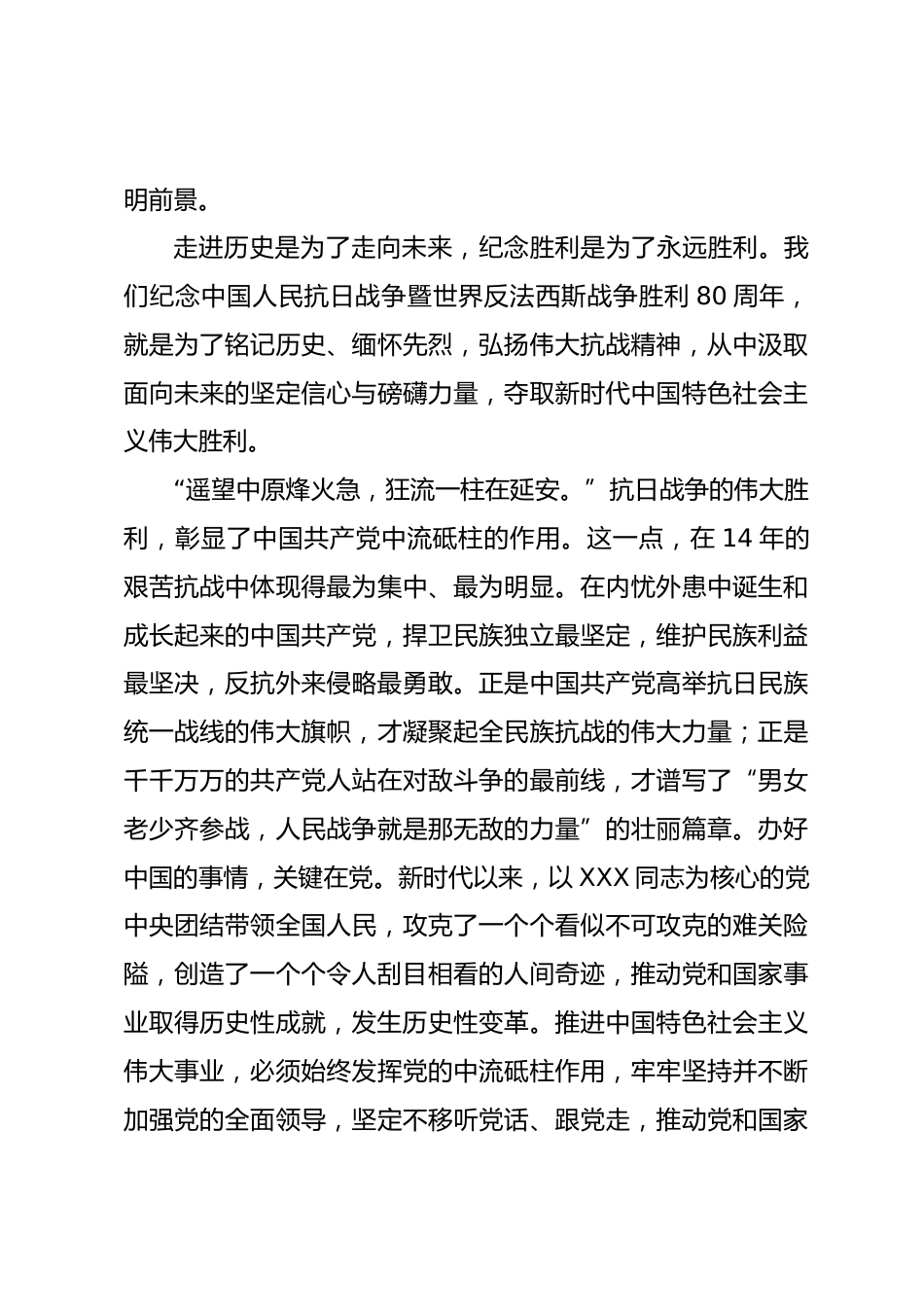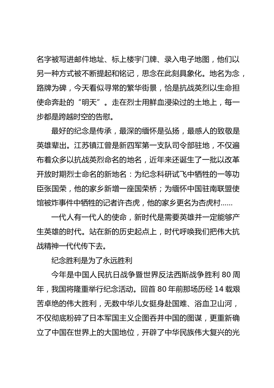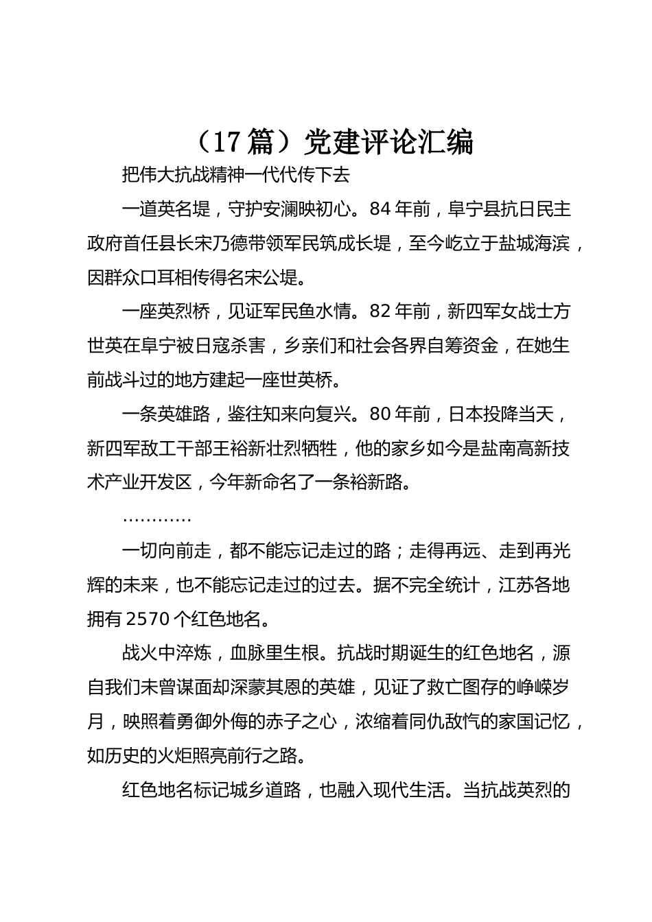 (17篇)黨建評(píng)論匯編把偉大抗戰(zhàn)精神一代代傳下去一道英名堤,守護(hù)安瀾映初心。84年前,阜寧縣抗日民主政府首任縣長(zhǎng)宋乃德帶領(lǐng)軍民筑成長(zhǎng)堤,至今屹立于鹽城海濱,因群眾口耳相傳得名宋公堤。一座英烈橋,見證軍民魚水情。82年前,新四軍女戰(zhàn)士方世英在阜寧被日寇殺害,鄉(xiāng)親們和社會(huì)各界自籌資金,在她生前戰(zhàn)斗過(guò)的地方建起一座世英橋。一條英雄路,鑒往知來(lái)向復(fù)興。80年前,日本投降當(dāng)天,新四軍敵工干部王裕新壯烈犧牲,他的家鄉(xiāng)如今是鹽南高新技術(shù)產(chǎn)業(yè)開發(fā)區(qū),今年新命名了一條裕新路?!磺邢蚯白撸疾荒芡涀哌^(guò)的路;走得再遠(yuǎn)、走到再光輝的未來(lái),也不能忘...