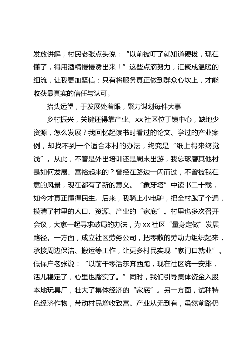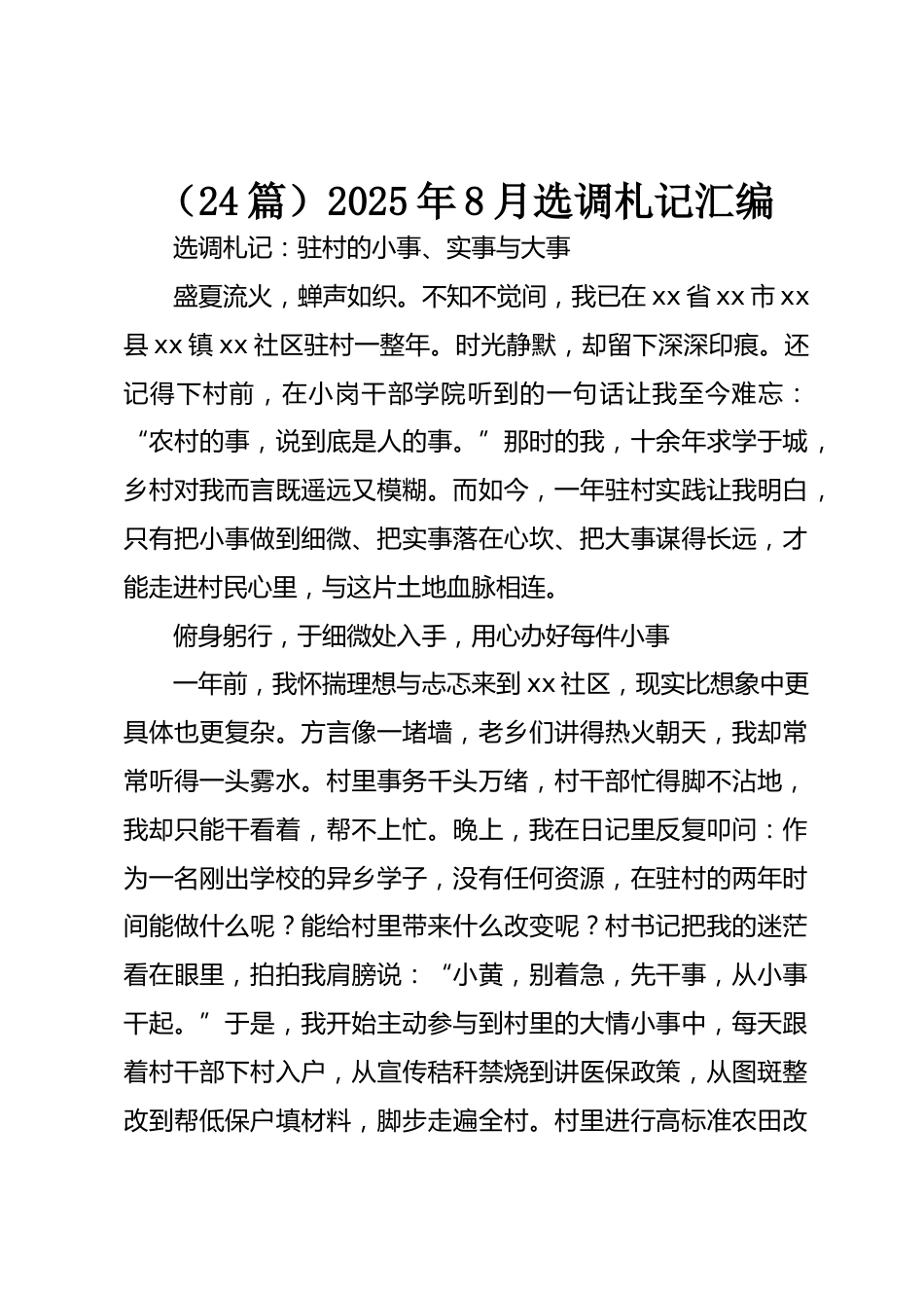 (24篇)2025年8月選調(diào)札記匯編選調(diào)札記:駐村的小事、實(shí)事與大事盛夏流火,蟬聲如織。不知不覺(jué)間,我已在xx省xx市xx縣xx鎮(zhèn)xx社區(qū)駐村一整年。時(shí)光靜默,卻留下深深印痕。還記得下村前,在小崗干部學(xué)院聽(tīng)到的一句話讓我至今難忘:“農(nóng)村的事,說(shuō)到底是人的事?!蹦菚r(shí)的我,十余年求學(xué)于城,鄉(xiāng)村對(duì)我而言既遙遠(yuǎn)又模糊。而如今,一年駐村實(shí)踐讓我明白,只有把小事做到細(xì)微、把實(shí)事落在心坎、把大事謀得長(zhǎng)遠(yuǎn),才能走進(jìn)村民心里,與這片土地血脈相連。俯身躬行,于細(xì)微處入手,用心辦好每件小事一年前,我懷揣理想與忐忑來(lái)到xx社區(qū),現(xiàn)實(shí)比想象中更具體也更復(fù)雜。方言像一堵...