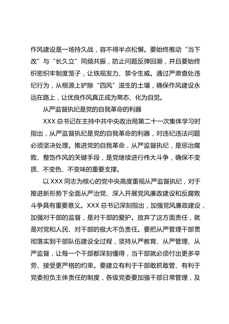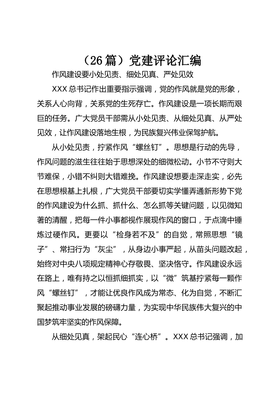 (26篇)黨建評論匯編作風(fēng)建設(shè)要小處見責(zé)、細處見真、嚴處見效XXX總書記作出重要指示強調(diào),黨的作風(fēng)就是黨的形象,關(guān)系人心向背,關(guān)系黨的生死存亡。作風(fēng)建設(shè)是一項長期而艱巨的任務(wù)。廣大黨員干部需從小處見責(zé)、從細處見真、從嚴處見效,讓作風(fēng)建設(shè)落地生根,為民族復(fù)興偉業(yè)保駕護航。從小處見責(zé),擰緊作風(fēng)“螺絲釘”。思想是行動的先導(dǎo),作風(fēng)問題的滋生往往始于思想深處的細微松動。小節(jié)不守則大節(jié)難保,小錯不糾則大錯難挽。作風(fēng)建設(shè)想要走深走實,必先在思想根基上扎根,廣大黨員干部要切實學(xué)懂弄通新形勢下黨的作風(fēng)建設(shè)為什么抓、抓什么、怎么抓等關(guān)鍵問題,以見微...