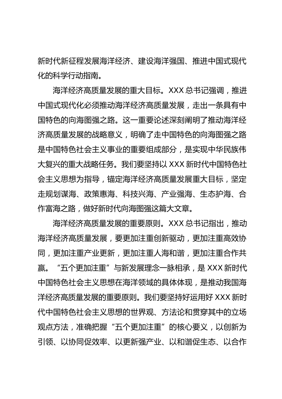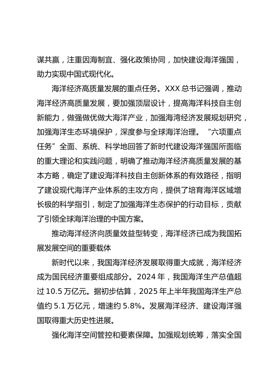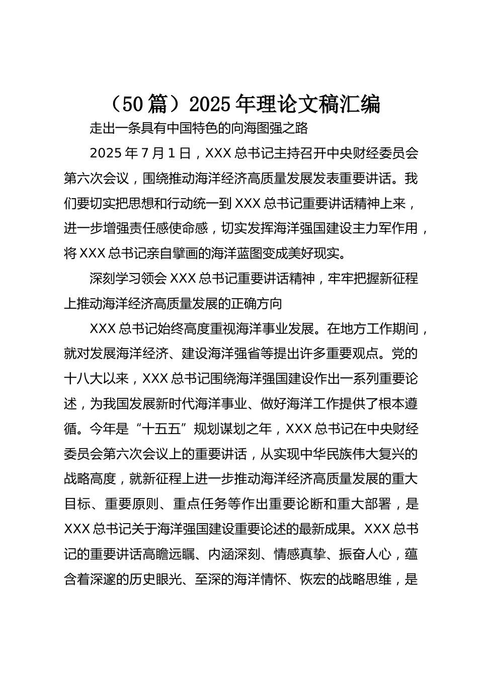 (50篇)2025年理論文稿匯編走出一條具有中國特色的向海圖強之路2025年7月1日,XXX總書記主持召開中央財經(jīng)委員會第六次會議,圍繞推動海洋經(jīng)濟高質(zhì)量發(fā)展發(fā)表重要講話。我們要切實把思想和行動統(tǒng)一到XXX總書記重要講話精神上來,進一步增強責(zé)任感使命感,切實發(fā)揮海洋強國建設(shè)主力軍作用,將XXX總書記親自擘畫的海洋藍圖變成美好現(xiàn)實。深刻學(xué)習(xí)領(lǐng)會XXX總書記重要講話精神,牢牢把握新征程上推動海洋經(jīng)濟高質(zhì)量發(fā)展的正確方向XXX總書記始終高度重視海洋事業(yè)發(fā)展。在地方工作期間,就對發(fā)展海洋經(jīng)濟、建設(shè)海洋強省等提出許多重要觀點。黨的十八大以來,XXX總書記圍繞海洋強...
