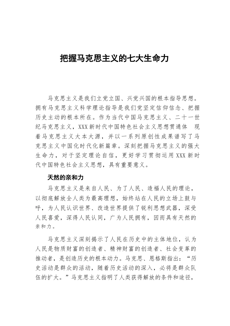把握馬克思主義的七大生命力馬克思主義是我們立黨立國(guó)、興黨興國(guó)的根本指導(dǎo)思想。擁有馬克思主義科學(xué)理論指導(dǎo)是我們黨堅(jiān)定信仰信念、把握歷史主動(dòng)的根本所在。作為當(dāng)代中國(guó)馬克思主義、二十一世紀(jì)馬克思主義,XXX新時(shí)代中國(guó)特色社會(huì)主義思想貫通體現(xiàn)著馬克思主義大本大源,并以一系列原創(chuàng)性成果譜寫(xiě)了馬克思主義中國(guó)化時(shí)代化新篇章。深刻把握馬克思主義的強(qiáng)大生命力,對(duì)于堅(jiān)定理論自信,更好學(xué)習(xí)貫徹運(yùn)用XXX新時(shí)代中國(guó)特色社會(huì)主義思想,具有重要意義。天然的親和力馬克思主義是來(lái)自人民、為了人民、造福人民的理論,以徹底解放全人類為最高理想,始終站在人民的立場(chǎng)上鼓...