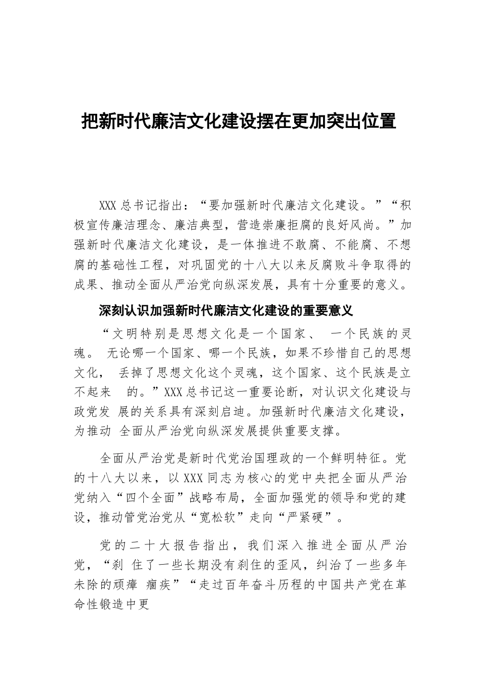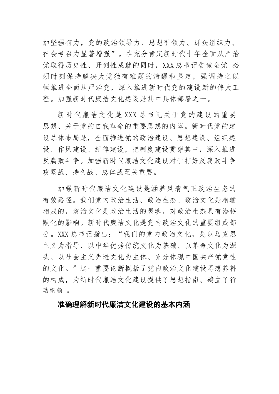 把新時代廉潔文化建設擺在更加突出位置XXX總書記指出:“要加強新時代廉潔文化建設?!薄胺e極宣傳廉潔理念、廉潔典型,營造崇廉拒腐的良好風尚?!奔訌娦聲r代廉潔文化建設,是一體推進不敢腐、不能腐、不想腐的基礎性工程,對鞏固黨的十八大以來反腐敗斗爭取得的成果、推動全面從嚴治黨向縱深發(fā)展,具有十分重要的意義。深刻認識加強新時代廉潔文化建設的重要意義“文明特別是思想文化是一個國家、一個民族的靈魂。無論哪一個國家、哪一個民族,如果不珍惜自己的思想文化,丟掉了思想文化這個靈魂,這個國家、這個民族是立不起來的。”XXX總書記這一重要論斷,對認識文化...