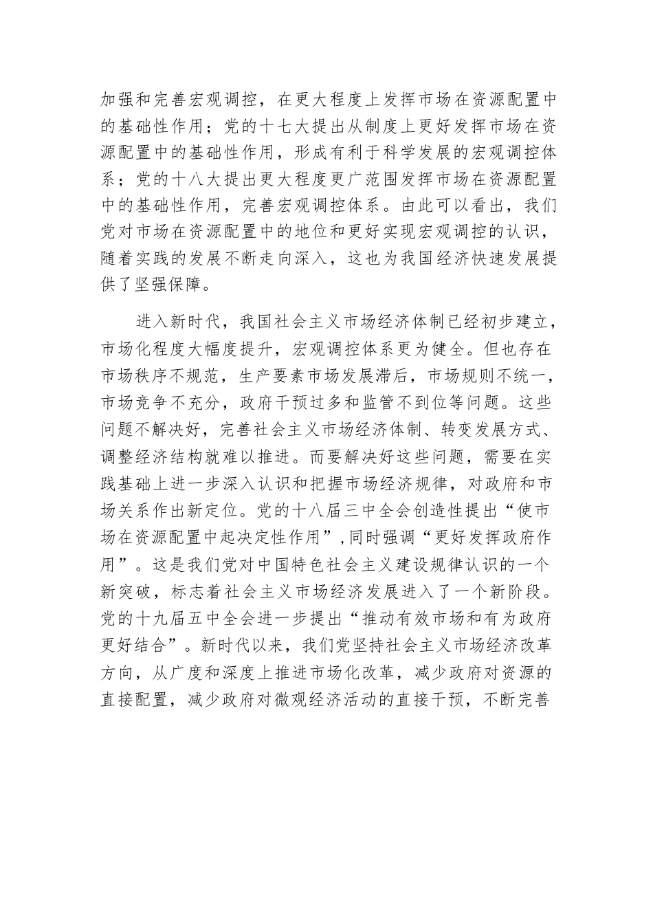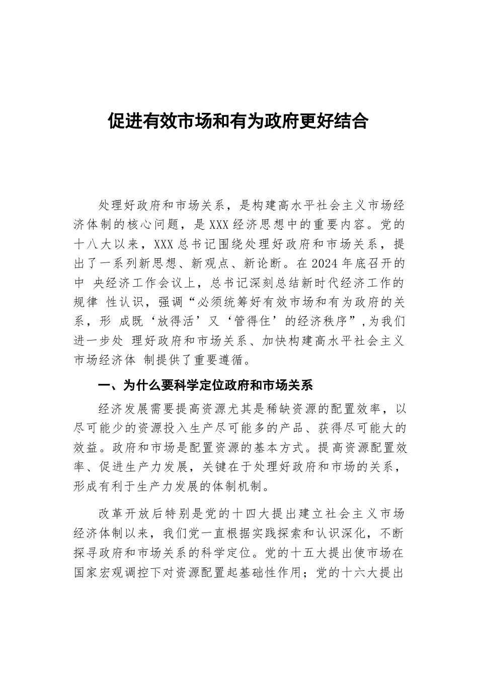 促進有效市場和有為政府更好結合處理好政府和市場關系,是構建高水平社會主義市場經濟體制的核心問題,是XXX經濟思想中的重要內容。黨的十八大以來,XXX總書記圍繞處理好政府和市場關系,提出了一系列新思想、新觀點、新論斷。在2024年底召開的中央經濟工作會議上,總書記深刻總結新時代經濟工作的規(guī)律性認識,強調“必須統(tǒng)籌好有效市場和有為政府的關系,形成既‘放得活’又‘管得住’的經濟秩序”,為我們進一步處理好政府和市場關系、加快構建高水平社會主義市場經濟體制提供了重要遵循。一、為什么要科學定位政府和市場關系經濟發(fā)展需要提高資源尤其是稀缺資源的配置...
