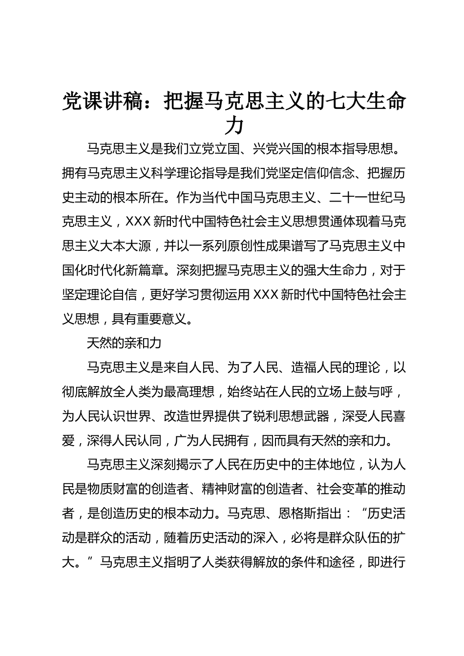 黨課講稿:把握馬克思主義的七大生命力馬克思主義是我們立黨立國、興黨興國的根本指導(dǎo)思想。擁有馬克思主義科學(xué)理論指導(dǎo)是我們黨堅定信仰信念、把握歷史主動的根本所在。作為當(dāng)代中國馬克思主義、二十一世紀(jì)馬克思主義,XXX新時代中國特色社會主義思想貫通體現(xiàn)著馬克思主義大本大源,并以一系列原創(chuàng)性成果譜寫了馬克思主義中國化時代化新篇章。深刻把握馬克思主義的強大生命力,對于堅定理論自信,更好學(xué)習(xí)貫徹運用XXX新時代中國特色社會主義思想,具有重要意義。天然的親和力馬克思主義是來自人民、為了人民、造福人民的理論,以徹底解放全人類為最高理想,始終站在人民...