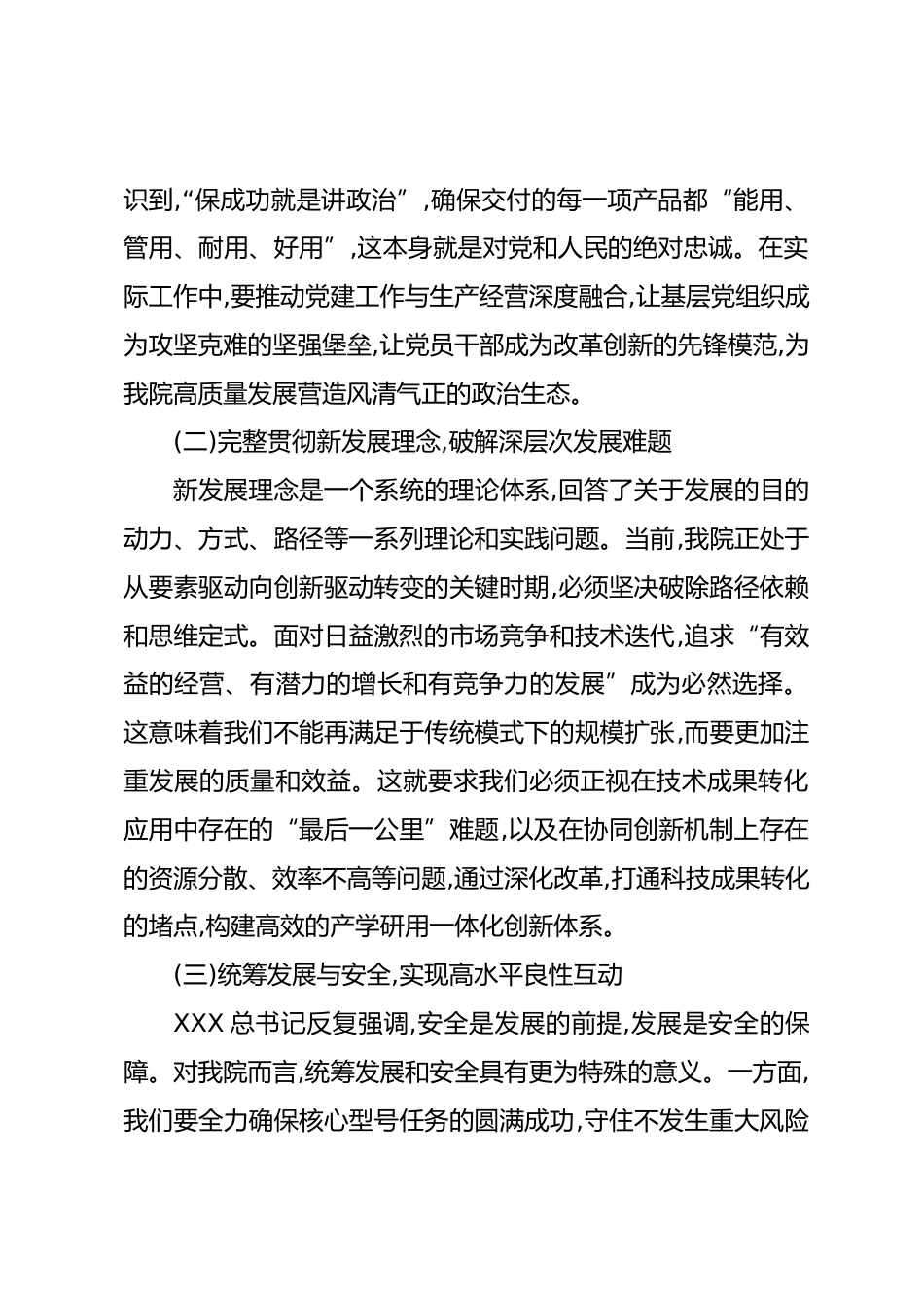 關(guān)于學習貫徹XXX經(jīng)濟思想以改革創(chuàng)新引領我院高質(zhì)量發(fā)展的思考與實踐(精品)XXX經(jīng)濟思想是XXX新時代中國特色社會主義思想的重要組成部分,是推動我國經(jīng)濟高質(zhì)量發(fā)展的科學指南和根本遵循。近期,院黨委理論學習中心組專題學習了XXX經(jīng)濟思想,為我們聚焦新階段、建立新模式、落實新戰(zhàn)略,以改革創(chuàng)新精神全面推進XX研究院高質(zhì)量發(fā)展指明了方向。結(jié)合我院作為國家戰(zhàn)略科技力量的定位以及本部門、本崗位的實際,現(xiàn)就如何學深悟透、知行合一,確保完成年度重點任務,談幾點思考和認識。一、深刻領會思想精髓,聚焦高質(zhì)量發(fā)展新階段進入新發(fā)展階段,內(nèi)外環(huán)境的深刻變化對我院的發(fā)展提出...