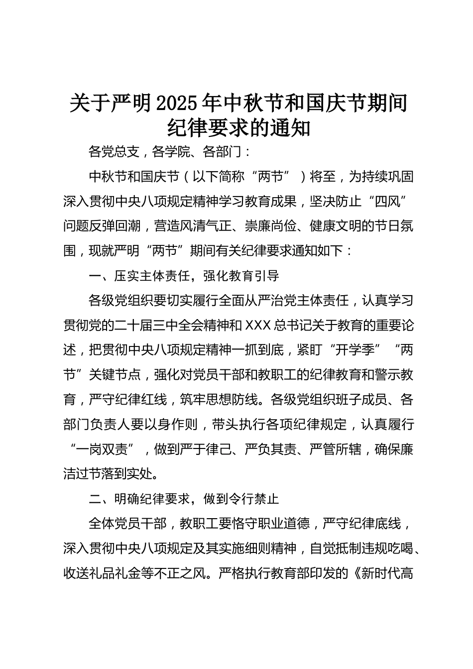 關于嚴明2025年中秋節(jié)和國慶節(jié)期間紀律要求的通知各黨總支,各學院、各部門:中秋節(jié)和國慶節(jié)(以下簡稱“兩節(jié)”)將至,為持續(xù)鞏固深入貫徹中央八項規(guī)定精神學習教育成果,堅決防止“四風”問題反彈回潮,營造風清氣正、崇廉尚儉、健康文明的節(jié)日氛圍,現就嚴明“兩節(jié)”期間有關紀律要求通知如下:一、壓實主體責任,強化教育引導各級黨組織要切實履行全面從嚴治黨主體責任,認真學習貫徹黨的二十屆三中全會精神和XXX總書記關于教育的重要論述,把貫徹中央八項規(guī)定精神一抓到底,緊盯“開學季”“兩節(jié)”關鍵節(jié)點,強化對黨員干部和教職工的紀律教育和警示教育,嚴守紀律...