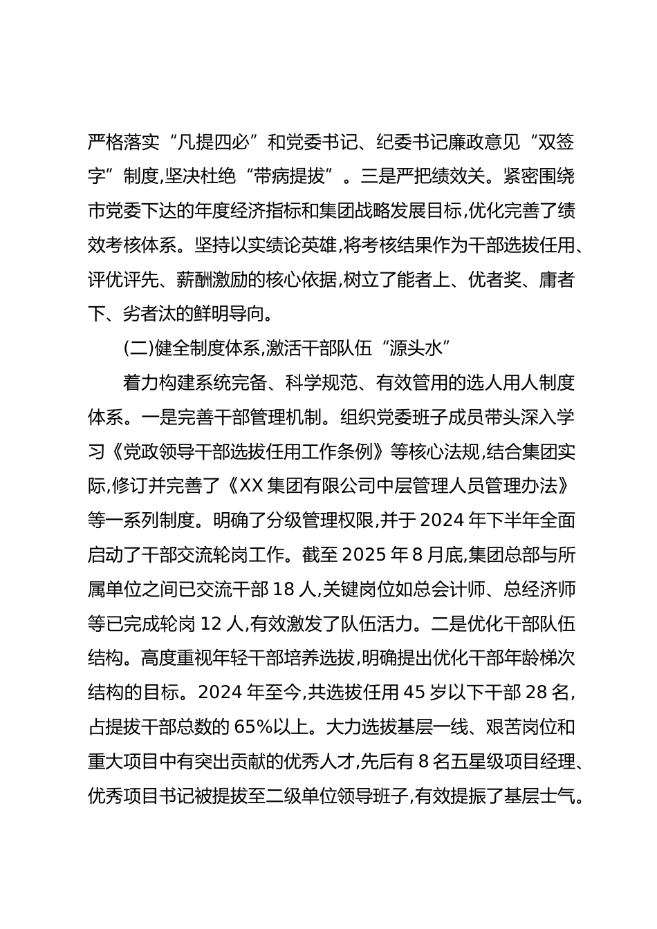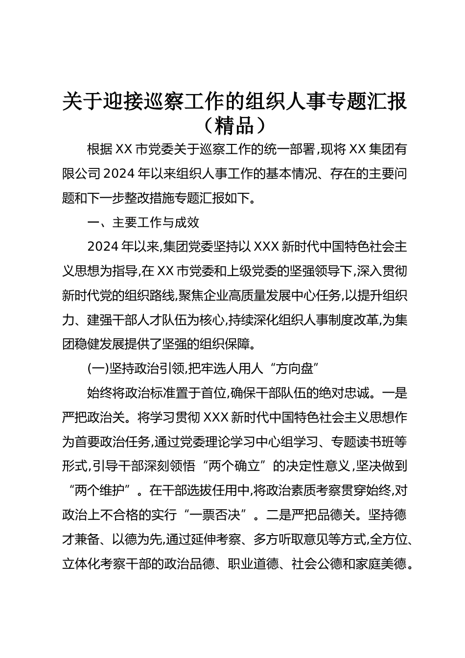 關于迎接巡察工作的組織人事專題匯報(精品)根據(jù)XX市黨委關于巡察工作的統(tǒng)一部署,現(xiàn)將XX集團有限公司2024年以來組織人事工作的基本情況、存在的主要問題和下一步整改措施專題匯報如下。一、主要工作與成效2024年以來,集團黨委堅持以XXX新時代中國特色社會主義思想為指導,在XX市黨委和上級黨委的堅強領導下,深入貫徹新時代黨的組織路線,聚焦企業(yè)高質量發(fā)展中心任務,以提升組織力、建強干部人才隊伍為核心,持續(xù)深化組織人事制度改革,為集團穩(wěn)健發(fā)展提供了堅強的組織保障。(一)堅持政治引領,把牢選人用人“方向盤”始終將政治標準置于首位,確保干部隊伍的絕對忠誠。一是嚴...