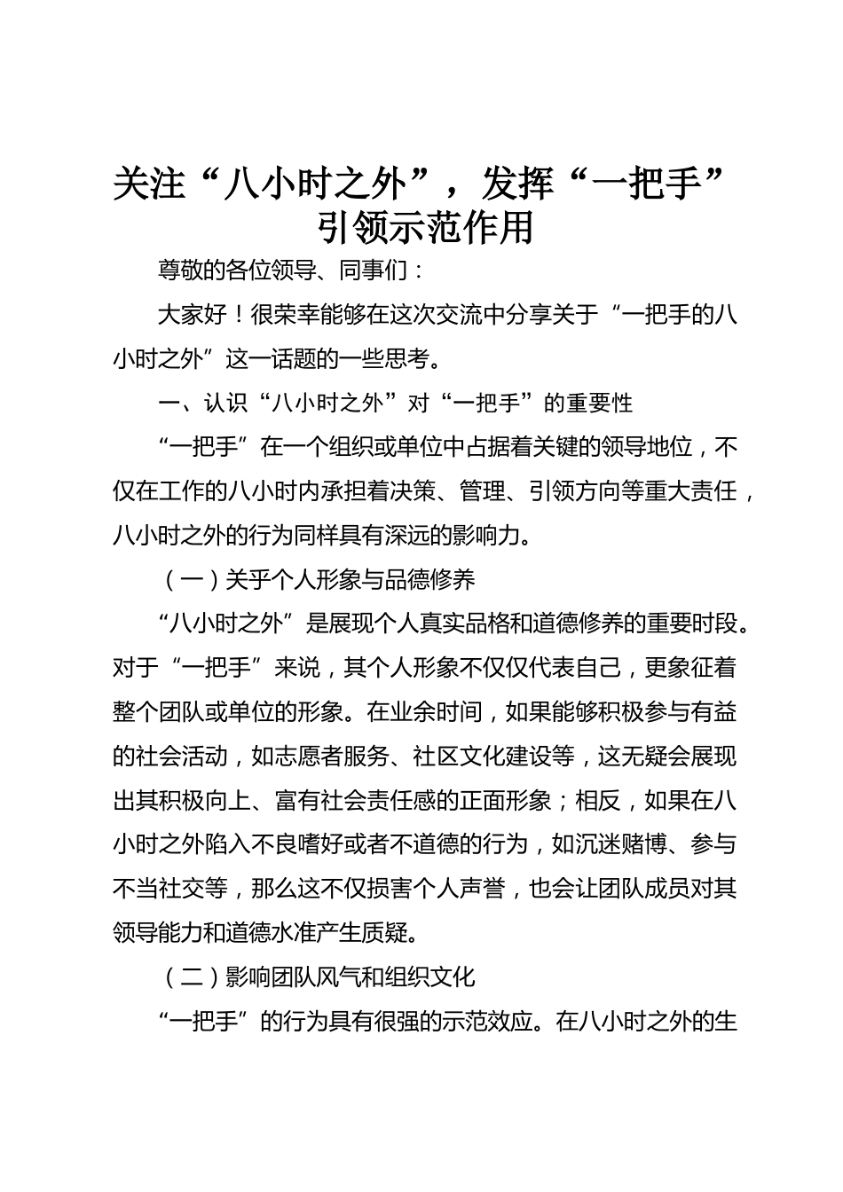 關(guān)注“八小時(shí)之外”,發(fā)揮“一把手”引領(lǐng)示范作用尊敬的各位領(lǐng)導(dǎo)、同事們:大家好!很榮幸能夠在這次交流中分享關(guān)于“一把手的八小時(shí)之外”這一話題的一些思考。一、認(rèn)識“八小時(shí)之外”對“一把手”的重要性“一把手”在一個(gè)組織或單位中占據(jù)著關(guān)鍵的領(lǐng)導(dǎo)地位,不僅在工作的八小時(shí)內(nèi)承擔(dān)著決策、管理、引領(lǐng)方向等重大責(zé)任,八小時(shí)之外的行為同樣具有深遠(yuǎn)的影響力。(一)關(guān)乎個(gè)人形象與品德修養(yǎng)“八小時(shí)之外”是展現(xiàn)個(gè)人真實(shí)品格和道德修養(yǎng)的重要時(shí)段。對于“一把手”來說,其個(gè)人形象不僅僅代表自己,更象征著整個(gè)團(tuán)隊(duì)或單位的形象。在業(yè)余時(shí)間,如果能夠積極參與有益的...