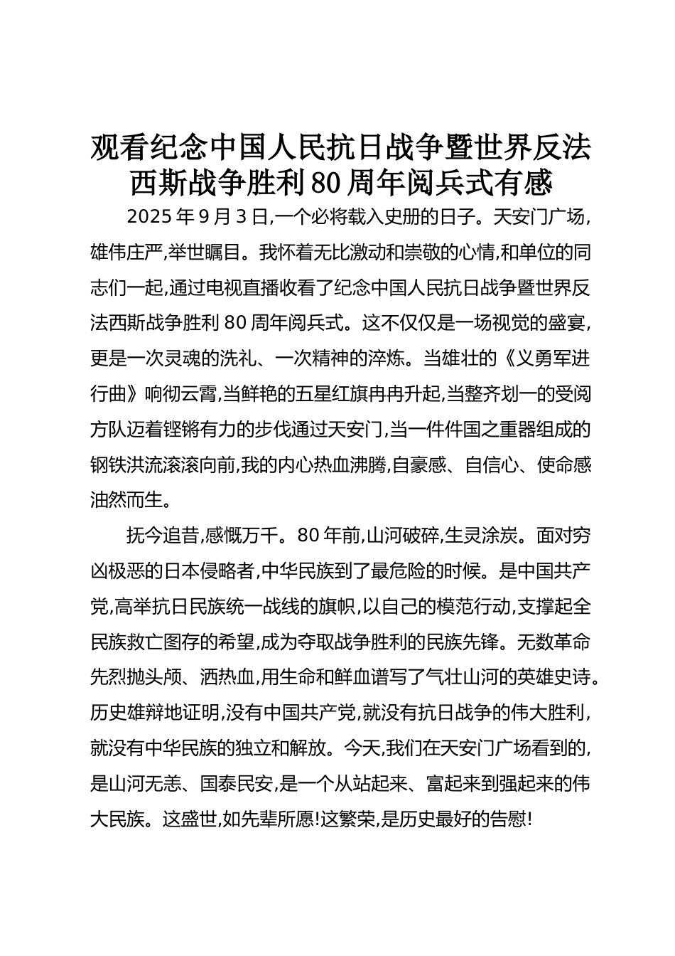 觀看紀(jì)念中國人民抗日戰(zhàn)爭暨世界反法西斯戰(zhàn)爭勝利80周年閱兵式有感2025年9月3日,一個(gè)必將載入史冊的日子。天安門廣場,雄偉莊嚴(yán),舉世矚目。我懷著無比激動和崇敬的心情,和單位的同志們一起,通過電視直播收看了紀(jì)念中國人民抗日戰(zhàn)爭暨世界反法西斯戰(zhàn)爭勝利80周年閱兵式。這不僅僅是一場視覺的盛宴,更是一次靈魂的洗禮、一次精神的淬煉。當(dāng)雄壯的《義勇軍進(jìn)行曲》響徹云霄,當(dāng)鮮艷的五星紅旗冉冉升起,當(dāng)整齊劃一的受閱方隊(duì)邁著鏗鏘有力的步伐通過天安門,當(dāng)一件件國之重器組成的鋼鐵洪流滾滾向前,我的內(nèi)心熱血沸騰,自豪感、自信心、使命感油然而生。撫今追昔,感慨萬千。80年前...