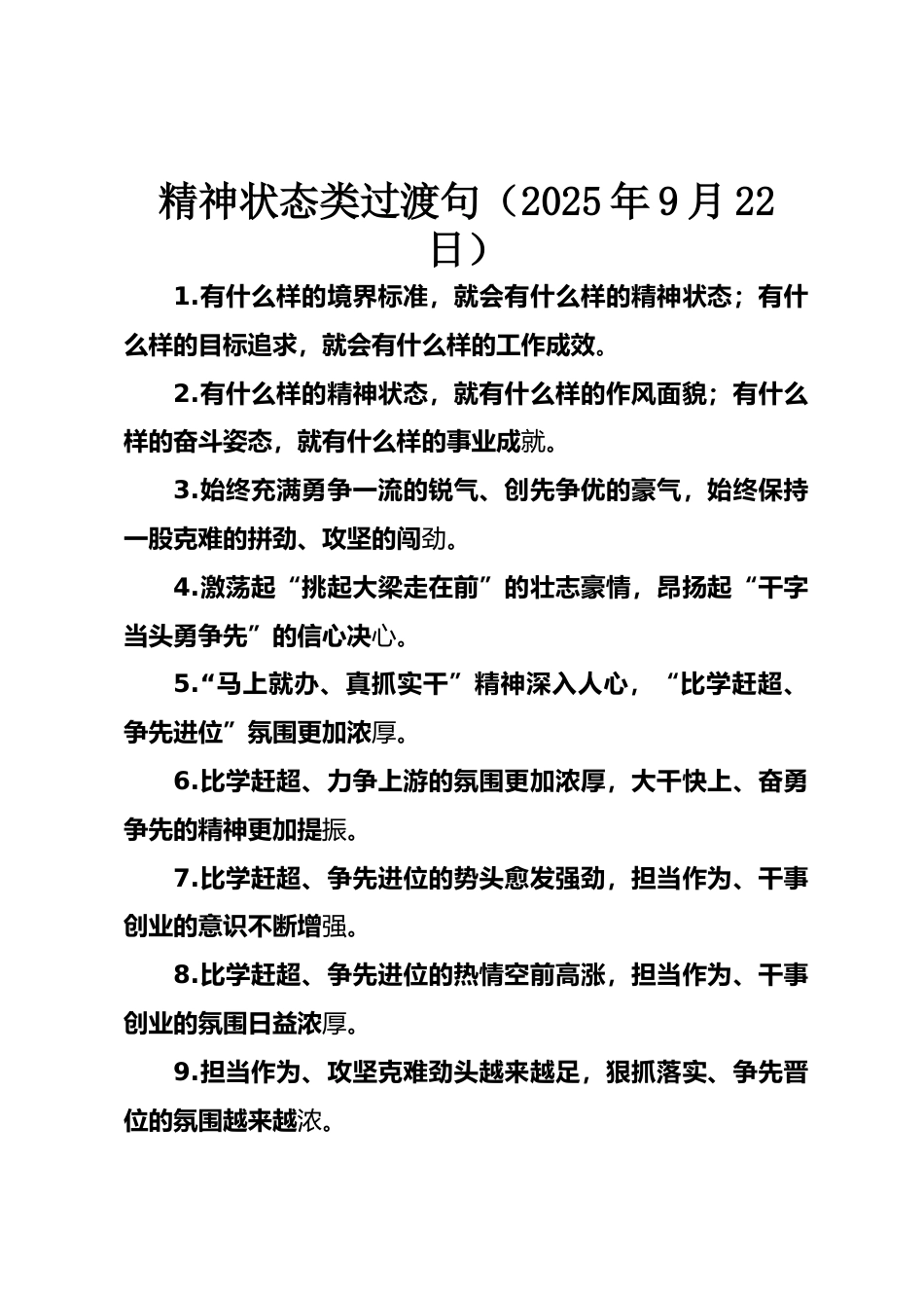 精神狀態(tài)類(lèi)過(guò)渡句(2025年9月22日)1.有什么樣的境界標(biāo)準(zhǔn),就會(huì)有什么樣的精神狀態(tài);有什么樣的目標(biāo)追求,就會(huì)有什么樣的工作成效。2.有什么樣的精神狀態(tài),就有什么樣的作風(fēng)面貌;有什么樣的奮斗姿態(tài),就有什么樣的事業(yè)成就。3.始終充滿(mǎn)勇?tīng)?zhēng)一流的銳氣、創(chuàng)先爭(zhēng)優(yōu)的豪氣,始終保持一股克難的拼勁、攻堅(jiān)的闖勁。4.激蕩起“挑起大梁走在前”的壯志豪情,昂揚(yáng)起“干字當(dāng)頭勇?tīng)?zhēng)先”的信心決心。5.“馬上就辦、真抓實(shí)干”精神深入人心,“比學(xué)趕超、爭(zhēng)先進(jìn)位”氛圍更加濃厚。6.比學(xué)趕超、力爭(zhēng)上游的氛圍更加濃厚,大干快上、奮勇?tīng)?zhēng)先的精神更加提振。7.比學(xué)趕超、爭(zhēng)先進(jìn)位的勢(shì)...