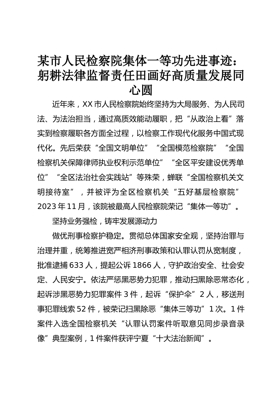 某市人民檢察院集體一等功先進(jìn)事跡:躬耕法律監(jiān)督責(zé)任田畫好高質(zhì)量發(fā)展同心圓近年來,XX市人民檢察院始終堅(jiān)持為大局服務(wù)、為人民司法、為法治擔(dān)當(dāng),通過高質(zhì)效能動(dòng)履職,把“從政治上看”落實(shí)到檢察履職各方面全過程,以檢察工作現(xiàn)代化服務(wù)中國式現(xiàn)代化。先后榮獲“全國文明單位”“全國模范檢察院”“全國檢察機(jī)關(guān)保障律師執(zhí)業(yè)權(quán)利示范單位”“全區(qū)平安建設(shè)優(yōu)秀單位”“全區(qū)法治社會(huì)實(shí)踐站”等殊榮,蟬聯(lián)“全國檢察機(jī)關(guān)文明接待室”,并被評(píng)為全區(qū)檢察機(jī)關(guān)“五好基層檢察院”2023年11月,該院被最高人民檢察院榮記“集體一等功”。堅(jiān)持業(yè)務(wù)強(qiáng)檢,鑄牢發(fā)展源動(dòng)力做優(yōu)刑事...
