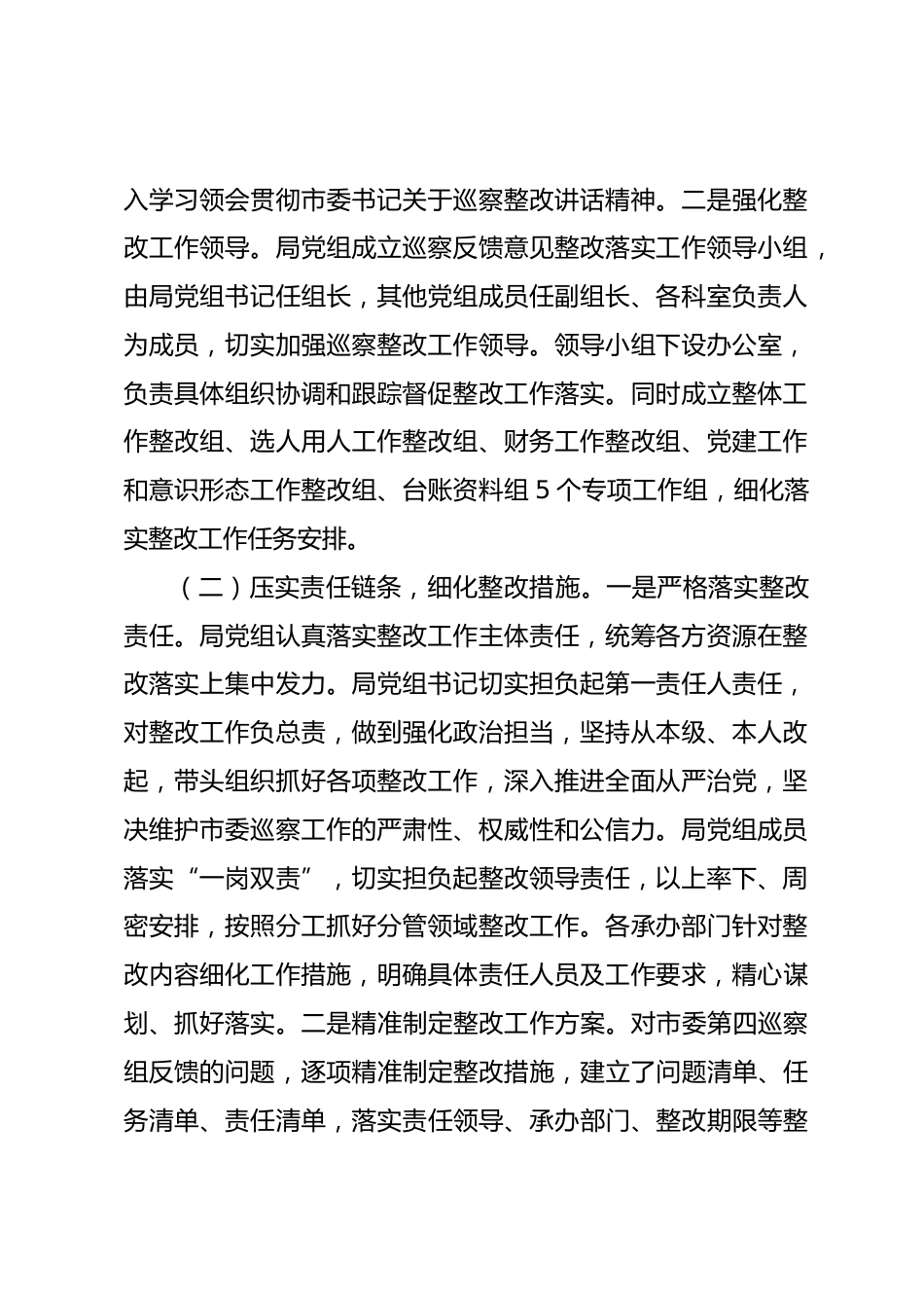 某市司法局黨組關(guān)于巡察整改進(jìn)展情況的通報(bào)3根據(jù)市委巡察工作的統(tǒng)一部署,市委第四巡察組于202x年3月上旬至6月上旬,對(duì)中共XX市司法局黨組進(jìn)行了巡察。202x年11月17日,市委第四巡察組向中共XX市司法局黨組反饋了巡察意見(jiàn)。按照黨務(wù)公開(kāi)原則和巡察工作有關(guān)要求,現(xiàn)將巡察整改進(jìn)展情況予以公布。一、堅(jiān)持黨的領(lǐng)導(dǎo),切實(shí)提高政治站位,以最強(qiáng)的責(zé)任感使命感和緊迫感部署推動(dòng)巡察整改工作(一)堅(jiān)持黨的領(lǐng)導(dǎo),提高思想認(rèn)識(shí)。局黨組全面貫徹新時(shí)代黨的建設(shè)總要求,把堅(jiān)持和加強(qiáng)黨的全面領(lǐng)導(dǎo)貫穿整改落實(shí)工作各方面全過(guò)程。切實(shí)提高政治站位,把思想統(tǒng)一到中央、省委和市委關(guān)...