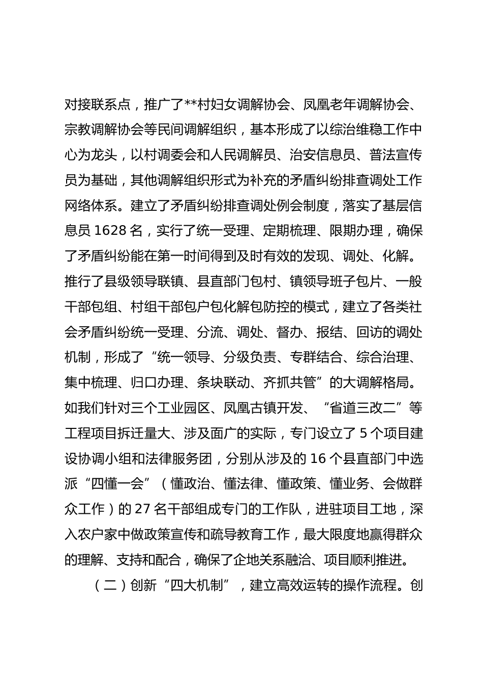 某縣矛盾糾紛排查調(diào)處和信訪維穩(wěn)工作經(jīng)驗(yàn)交流材料**縣345思路有力維護(hù)社會(huì)大局和諧穩(wěn)定近年來,**縣針對經(jīng)濟(jì)轉(zhuǎn)型升級、重大項(xiàng)目上馬、征地拆遷量大等可能引發(fā)矛盾糾紛增多的實(shí)際,從完善“三級網(wǎng)絡(luò)”、創(chuàng)新“四大機(jī)制”、強(qiáng)化“五項(xiàng)措施”入手,關(guān)口前移筑防線,創(chuàng)新機(jī)制增活力,條塊聯(lián)動(dòng)保平安,形成了人民調(diào)解、司法調(diào)解、行政調(diào)解的三調(diào)聯(lián)動(dòng)新格局,及時(shí)化解了一批社會(huì)矛盾糾紛,總體呈現(xiàn)出“三降三升”的良好勢頭(即:基層公安調(diào)解負(fù)擔(dān)、信訪矛盾糾紛總量、刑事治安案件明顯下降,矛盾糾紛移送率、調(diào)處成功率、群眾滿意率明顯上升),全縣無政治性事件、重大群體性...