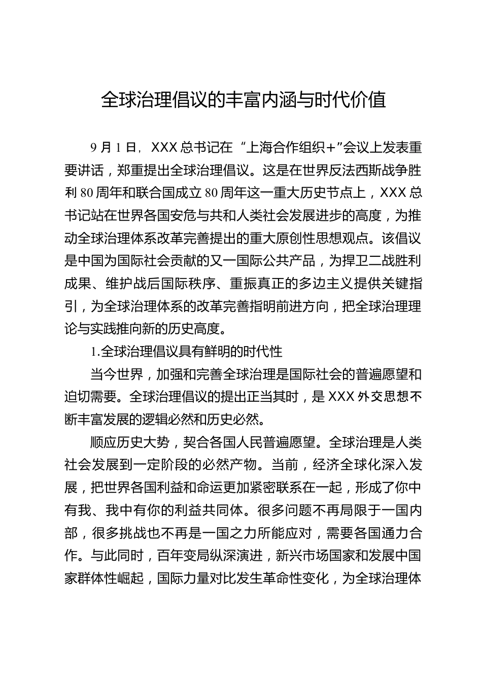 全球治理倡議的豐富內(nèi)涵與時(shí)代價(jià)值9月1日,XXX總書記在“上海合作組織+”會(huì)議上發(fā)表重要講話,鄭重提出全球治理倡議。這是在世界反法西斯戰(zhàn)爭(zhēng)勝利80周年和聯(lián)合國(guó)成立80周年這一重大歷史節(jié)點(diǎn)上,XXX總書記站在世界各國(guó)安危與共和人類社會(huì)發(fā)展進(jìn)步的高度,為推動(dòng)全球治理體系改革完善提出的重大原創(chuàng)性思想觀點(diǎn)。該倡議是中國(guó)為國(guó)際社會(huì)貢獻(xiàn)的又一國(guó)際公共產(chǎn)品,為捍衛(wèi)二戰(zhàn)勝利成果、維護(hù)戰(zhàn)后國(guó)際秩序、重振真正的多邊主義提供關(guān)鍵指引,為全球治理體系的改革完善指明前進(jìn)方向,把全球治理理論與實(shí)踐推向新的歷史高度。1.全球治理倡議具有鮮明的時(shí)代性當(dāng)今世界,加強(qiáng)和完善...